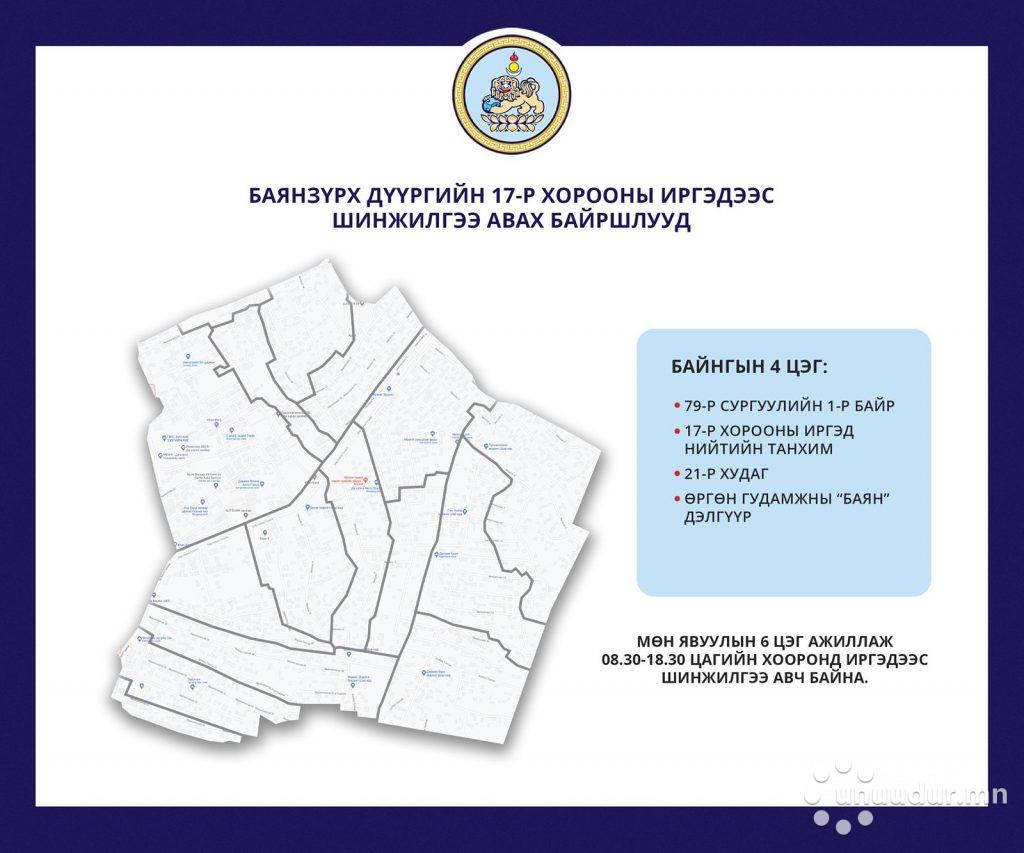 Баянзүрх дүүргийн 17 дугаар хороонд “КОВИД 19” халдварын тохиолдол батлагдаж, голомтлон тархаж болзошгүй нөхцөл байдал үүссэн тул 2021 оны 01 дүгээр сарын 14-ны 06.00 цагаас 2021 оны 01 дүгээр 16-ны 23.00 цаг хүртэл хязгаарлалтын дэглэмд шилжүүлж, иргэдийг шинжилгээнд хамруулах ажлыг зохион байгуулахаар боллоо.