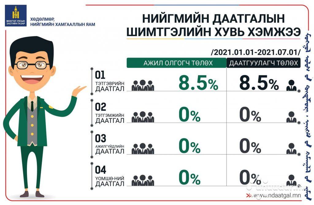 "Ковид-19" цар тахлын үед аж ахуйн нэгж, байгууллагын санхүүгийн хүндрэлийг шийдэх нэг арга хэмжээ болгож УИХ-аас Нийгмийн даатгалын шимтгэлээс чөлөөлөх, ажилгүйдлийн даатгалын сангаас дэмжлэг үзүүлэх тухай хуулийг баталсан. Дээрх хуулийн үйлчлэлд төрийн байгууллагаас бусад бүх аж ахуйн нэгж, байгууллага 2021 оны нэгдүгээр сараас 2021 оны долдугаар сар хүртэл зургаан сарын хугацаанд ажил олгогч, даатгуулагч нь зөвхөн тэтгэврийн даатгалын 8.5 хувийн шимтгэлийг тус бүр төлөх ба бусад төрлийн шимтгэлээс чөлөөлөхөөр зохицуулсан. Энэ хугацаанд 198.9 тэрбум төгрөгийн шимтгэлийн хөнгөлөлт үзүүлэх юм. Өмнөх хугацаанд буюу 2020 оны дөрөвдүгээр сараас эхлэн мөн оны аравдугаар сар хүртэл зургаан сарын хугацаанд ажил олгогч, даатгуулагчийн нийгмийн даатгалын шимтгэлийг бүрэн чөлөөлсөн. Мөн өнгөрсөн оны аравдугаар сараас 2021 оны нэгдүгээр сар хүртэл гурван сарын хугацаанд зөвхөн тэтгэврийн даатгалын шимтгэлийг ажил олгогч, даатгуулагч тус бүр таван хувиар төлж, бусад даатгалын шимтгэлээс бүрэн чөлөөлөгдсөн. 2020 онд хэрэгжүүлсэн шимтгэлээс чөлөөлөх, хөнгөлөх арга хэмжээнд урьдчилсан байдлаар 38.4 мянган ажил олгогч, 571 мянган даатгуулагч хамрагдаж, нийт 710.9 тэрбум төгрөгийн шимтгэлээс чөлөөлөгджээ.