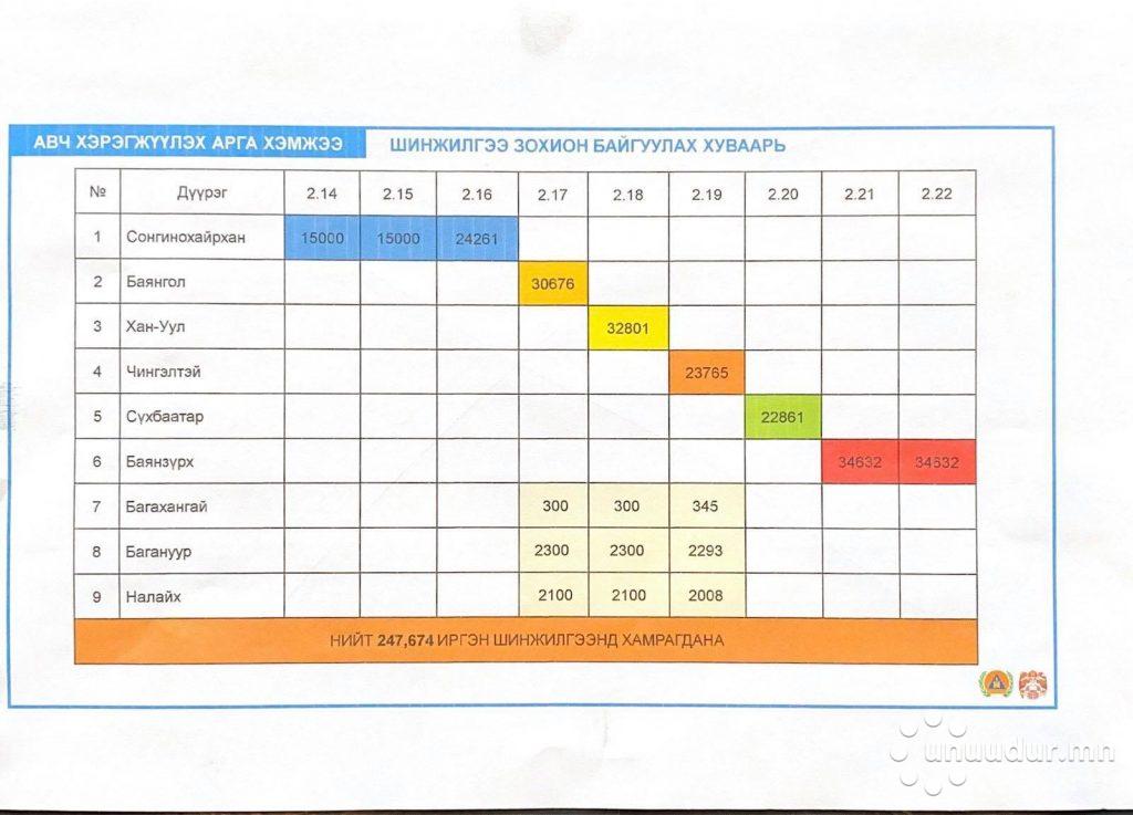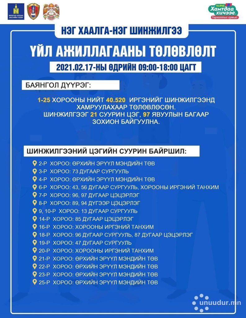 Нийслэлийн есөн дүүрэгт хуваарийн дагуу "Нэг хаалга-Нэг шинжилгээ" үйл ажиллагааг зохион байгуулж буй. Энэ дагуу өнөөдөр Баянгол дүүргийн өрх бүрээс нэг иргэнийг коронавирусийн халдвар илрүүлэх шинжилгээнд хамруулах юм. Өргөтгөсөн шинжилгээг суурин 21 цэг, явуулын 97 цэгт авна. "Ковид-19"-ийн шинжилгээ өгөхөөр очихдоо иргэний үнэмлэхээ авч очих шаардлагатайг сануулж байна. Ийнхүү өнөөдөр Баянголчуудыг, маргааш Хан-Уул дүүргийн иргэдийг коронавирусийн шинжилгээнд хамруулна. Иргэд хоёрдугаар сарын 11-13-нд шинжилгээнд хамрагдсан бол шинжилгээ дахин өгөх шаардлагагүй гэнэ.