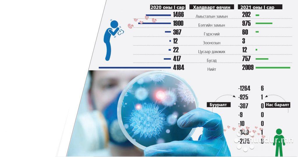 Хүн амын эрүүл мэндийн 2021 оны эхний сарын үзүүлэлтийг Эрүүл мэндийн хөгжлийн төвөөс тодрууллаа. Өнгөрсөн сард улсын хэмжээнд 2009 хүн 16 төрлийн халдварт өвчинд өртжээ. Энэ нь өмнөх жилийн мөн үеийнхээс 2175 тохиолдлоор буурсан үзүүлэлт юм байна. Нярайн нянгийн гаралтай үжил, коронавирусийн халдвар 2-564-өөр нэмэгдсэнээс бусад өвчлөл 1-1128 тохиолдлоор буурсан аж. Халдварт өвчнөөр найман хүн нас барсны зургаа нь сүрьеэ, нэг нь төрөлхийн тэмбүү, бас нэг нь “Ковид-19”-ийн улмаас энджээ. Ингэснээр халдварт өвчнөөр нас барсан хүний тоо өнгөрсөн оны нэгдүгээр сарынхаас зургаагаар цөөрсөн байна. Тэгвэл амьсгалын замын халдварт өвчинд 202 хүн өртсөн нь 2020 оныхоос 7.3 дахин буурсан үзүүлэлт аж. Бэлгийн замын халдварт өвчинд 48.7 хувиар буурсан эерэг мэдээ байна. Халдварт өвчин ийнхүү буурахад хөл хорионы дэглэм голлон нөлөөлсөн гэж албаныхан хэллээ.