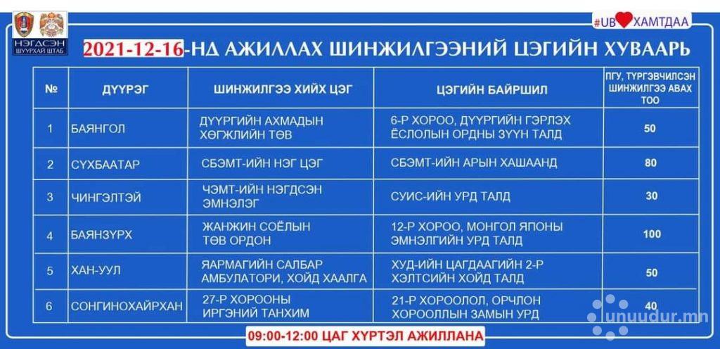 Улаанбаатар хотод энэ сарын 16-нд буюу өнөөдөр ажиллах шинжилгээний цэгүүдийн цагийн хуваарь, хаяг байршлыг танилцуулж байна.