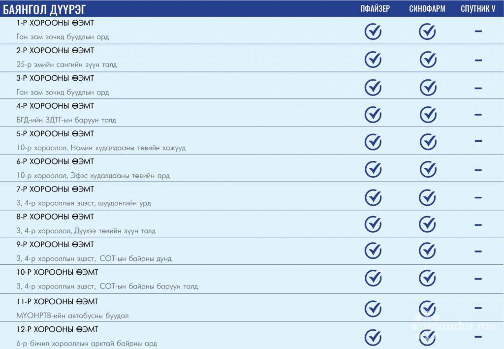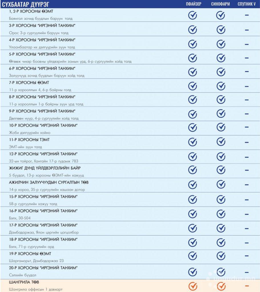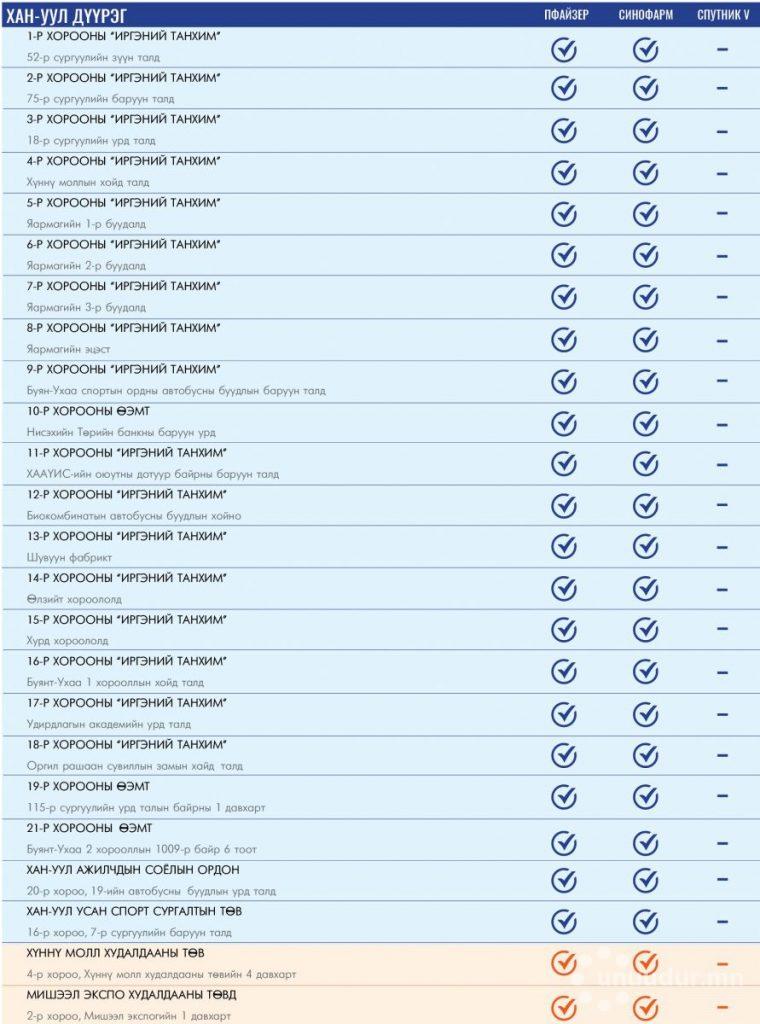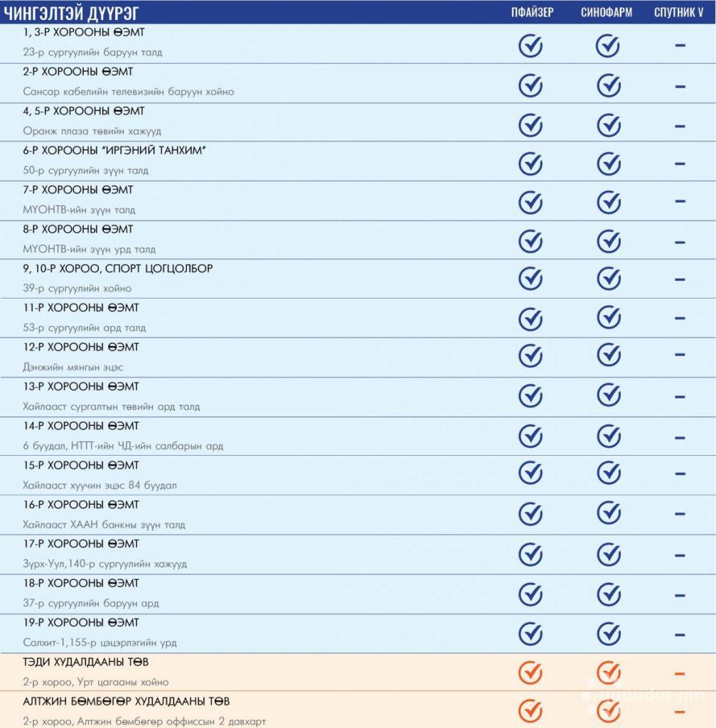 Өнөөдөр Улаанбаатар хотод 171 суурин, 11 түр цэгт 184 багийн 851 эмч, ажилтан ажиллаж, 6000 иргэнийг дархлаажуулахаар төлөвлөлөө. Томоохон зах, худалдааны төвд 11 түр цэг ажиллана. Та өөрт ойр вакцины аль ч цэгт очиж дархлаажуулалтад хамрагдах боломжтой. Дархлаажуулалтын цэгүүд 09:00-20:00 цаг хүртэл ажиллана.