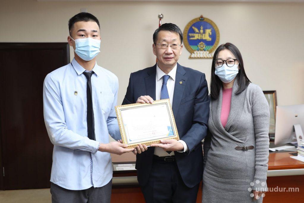Өнгөрсөн аравдугаар сард сурагч хүү галын аюулаас хүний амь аварсан тухай бид өмнө мэдээлсэн. Тэгвэл өнөөдөр Т.Эрдэм хүүг ээжийнх нь хамт Боловсрол, шинжлэх ухааны яаманд урьж сайдын нэрэмжит шагнал, нэг сая төгрөгөөр урамшуулжээ.