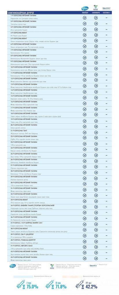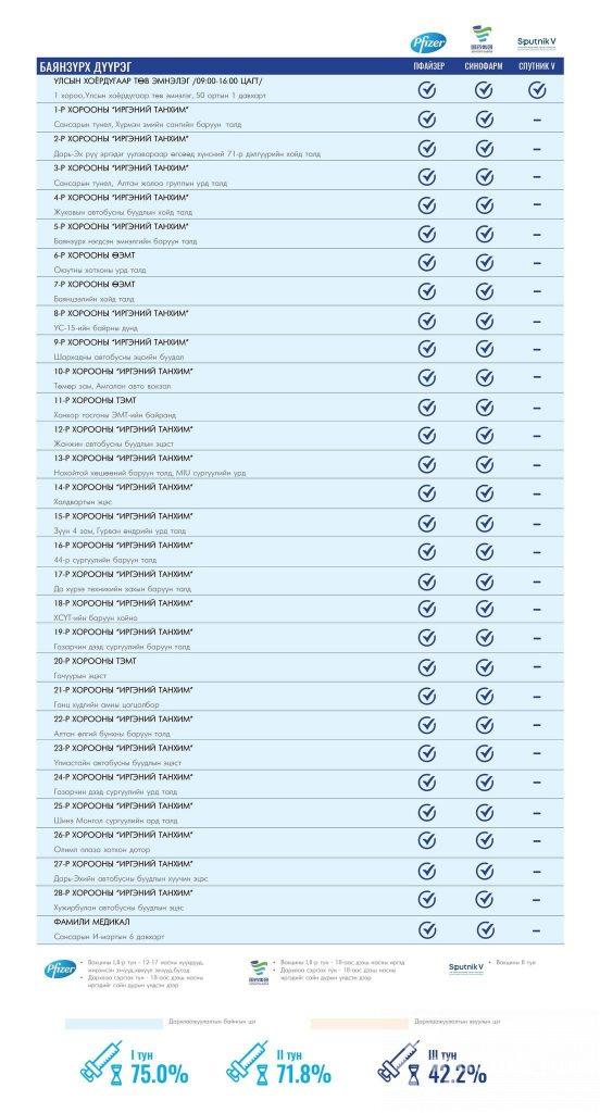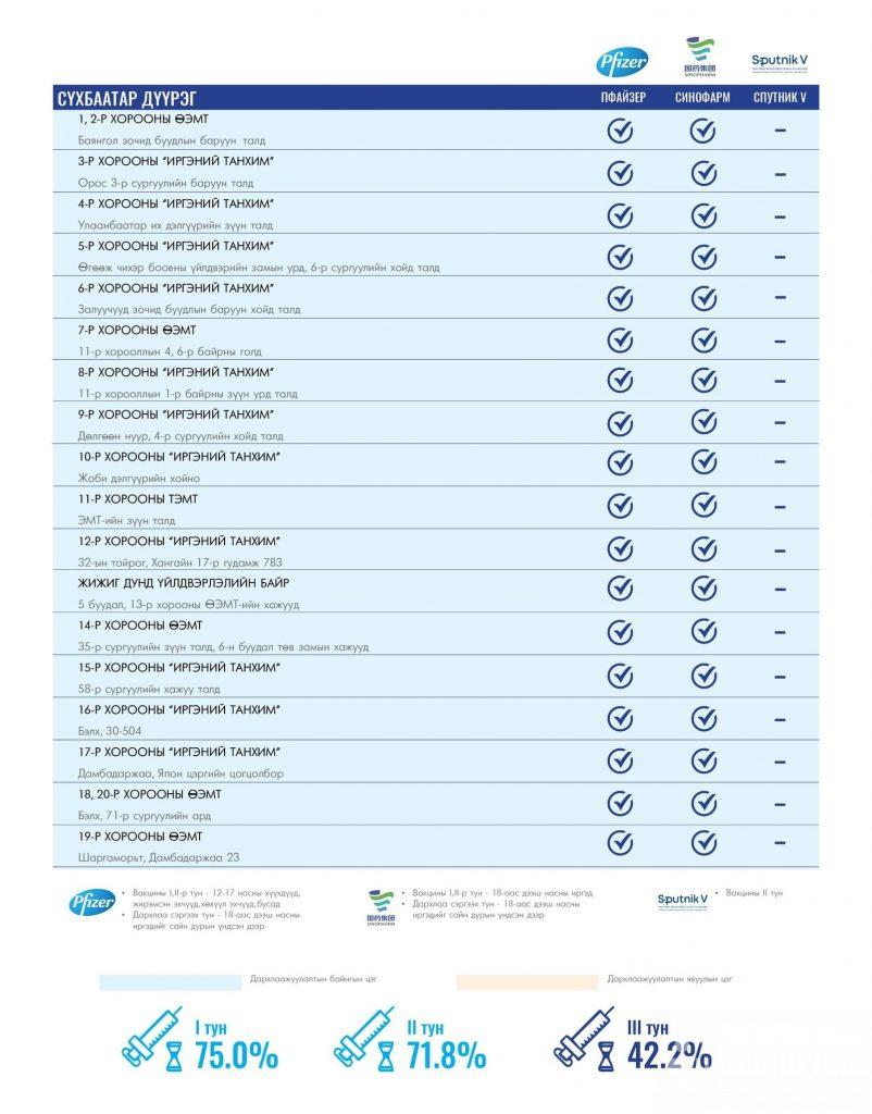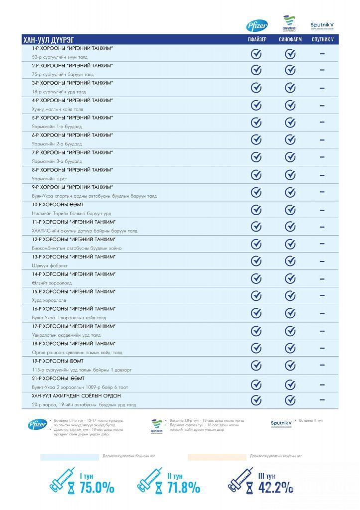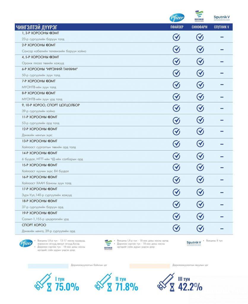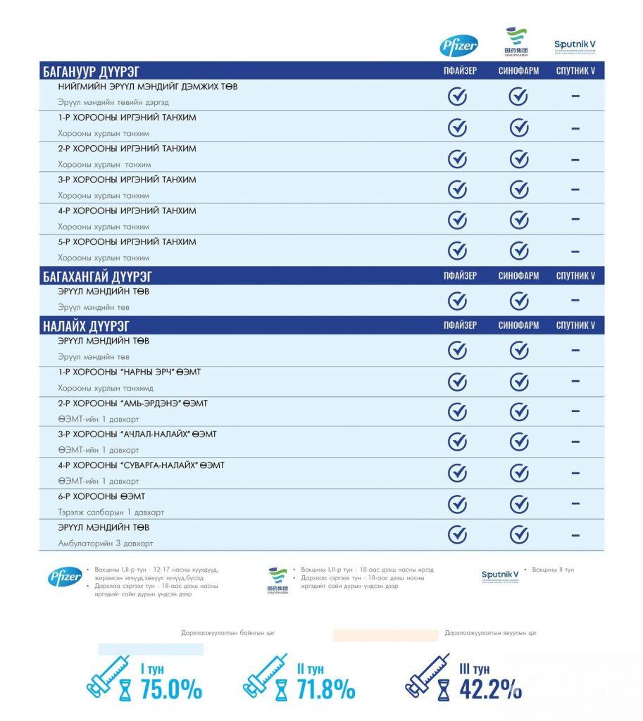 Вакцинжуулалт эхэлснээс хойш нийслэлийн нийт хүн амын I тунгийн хамралт 75 хувь, II тунгийн хамралт 71.8 хувь, нэмэлт тунгийн хамрагдалт 42.3 хувь байна. Зорилтот бүлгийн буюу 2,988 жирэмсэн эх, 12-15 насны 68,322, 16-17 насны 26,926 хүүхэд тус тус дархлаажуулалтын бүрэн тунд хамрагджээ.