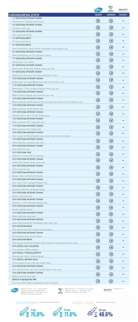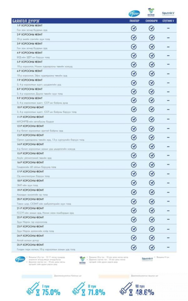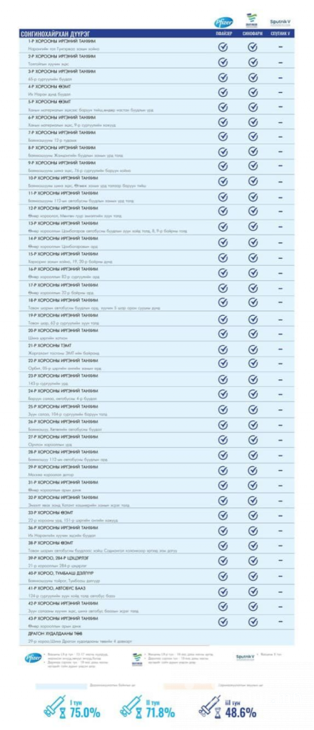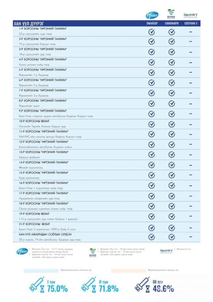 Иргэд өөрт ойр байрлах аль ч цэгт очиж дархлаажуулалтад хамрагдах боломжтой. Дархлаажуулалтын цэгүүд 09:00-18:00 цаг хүртэл ажиллана. Дархлаажуулалтын цэгүүдийг дүүрэг тус бүрээр танилцуулж байна.