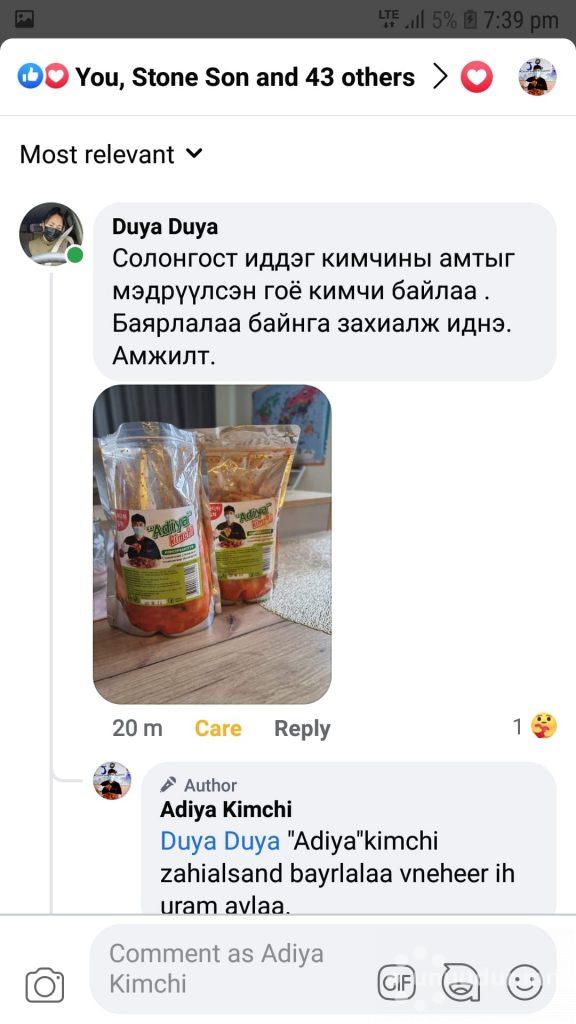 Гэхдээ миний хийсэн кимчины амтанд орсон хүмүүс захиалсаар байгаад баяртай байдаг. Солонгост хоолны газар ажлуулж байхад нутгийн хүмүүс миний хийсэн кимчиг идэхдээ “Яг солонгос кимчи шиг байна. Амт нь мөн байна” гэдэг байсан. Би яг тэнд дардаг байсан кимчинийхээ орц найрлагаар дардаг нь захиалагчдын маань сэтгэлд нийцдэг юм болов уу” гэв.