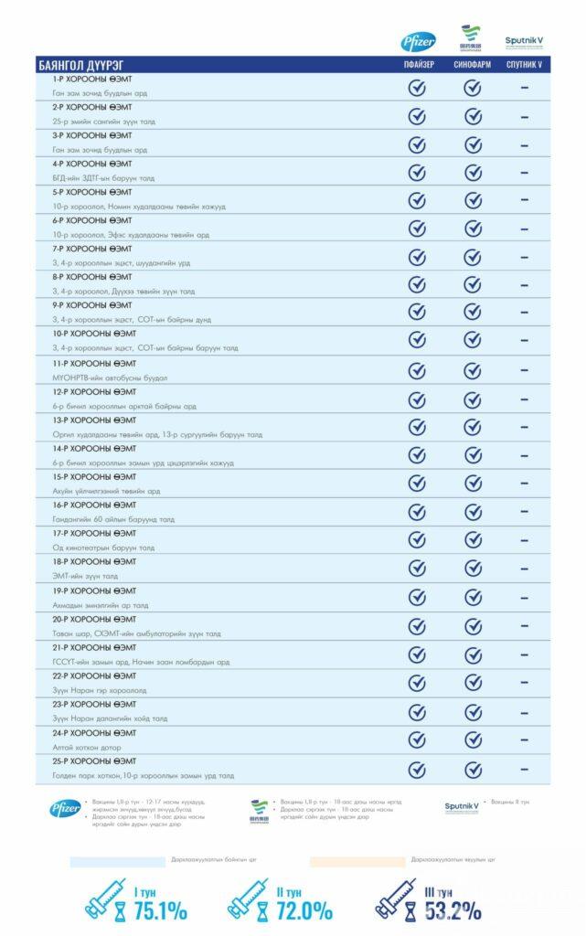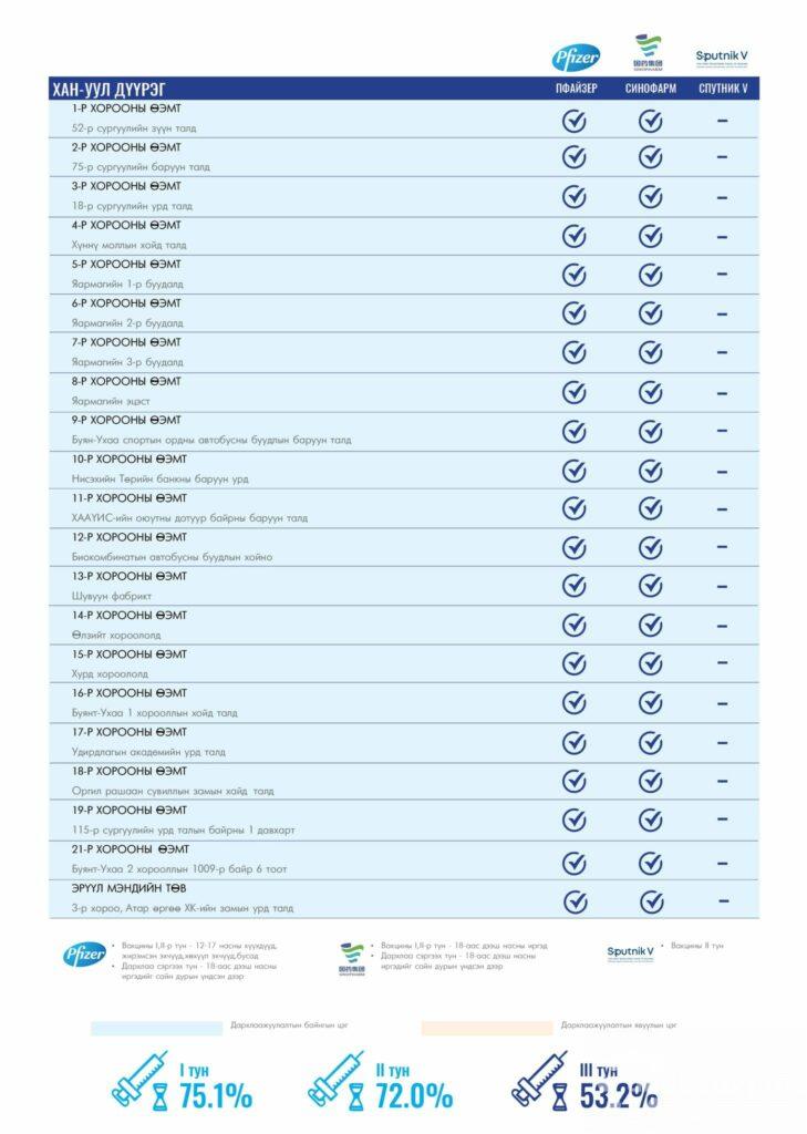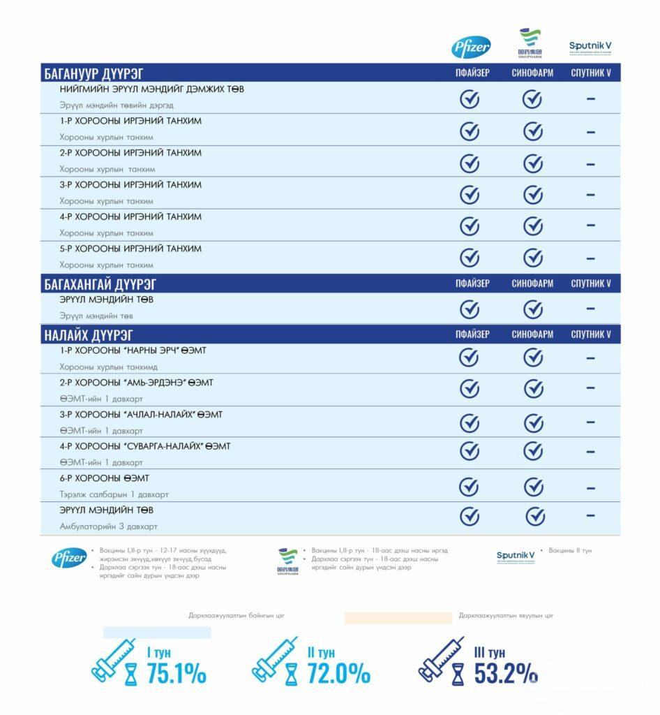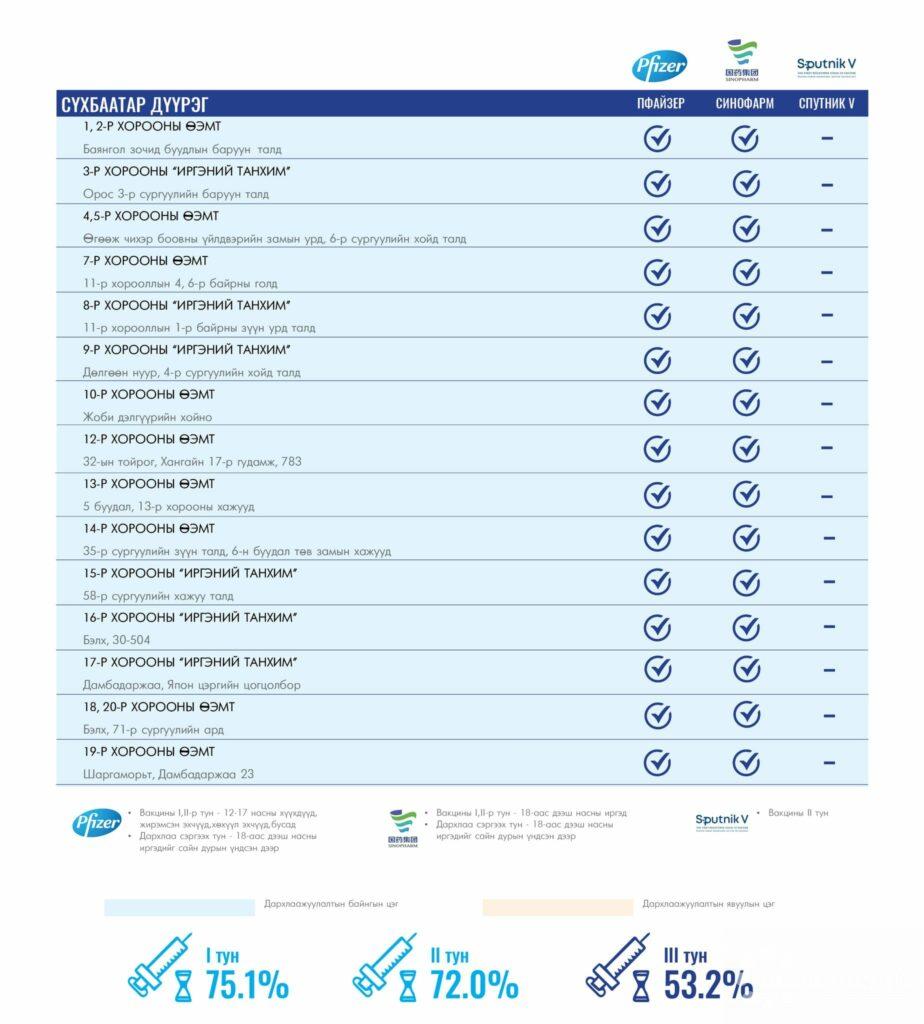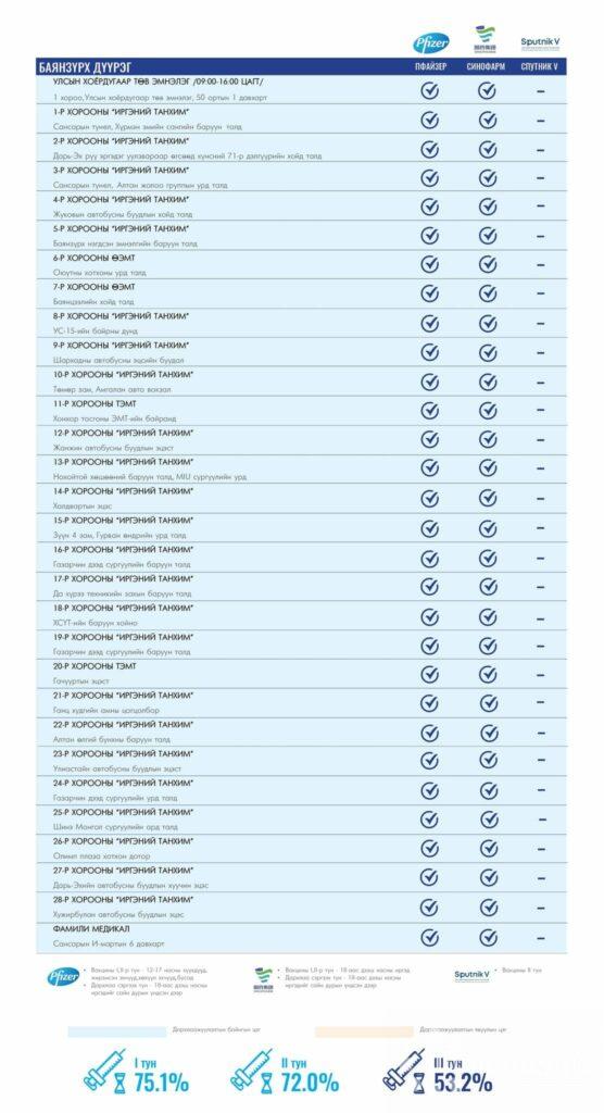 Өнөөдөр Улаанбаатар хотод суурин 156 цэгт 156 багийн 746 эмч, ажилтан ажиллана. Та өөрт ойр вакцины аль ч цэгт очиж дархлаажуулалтад хамрагдах боломжтой. Дархлаажуулалтын цэгүүд 09:00-17:30 цаг хүртэл ажиллана.