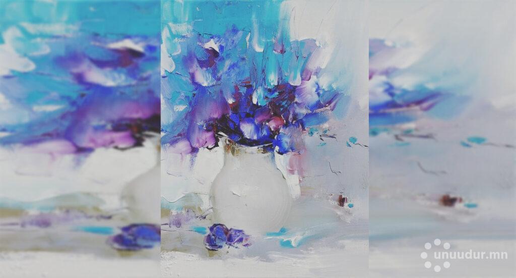 -Байж болох бүх л өнгийг ашиглаж, илүү сонирхолтой өнгө гаргаж зурахыг хичээдэг. Мэдээж цэцэг зурахад тод, гэгээлэг өнгөнүүдээр түлхүү “тоглоно”. Тэдгээрээс цэнхэрийн төрлийн өнгийг өөрийн мэдэлгүй барьчихсан суудаг. Цайвар цэнхэр, номин цэнхэр, гүн хөх гэхчлэн. Заримдаа түүнээсээ зугтаах гэж оролдоно. Гэхдээ бүтээл бүрт хийцийн ялгаа бий. Зураг болгоноо өнгийн сонирхолтой зохицол, шийдэлтэй байлгахаар зорьсон. Уран бүтээлч хүн яаж илүү шинэлэг, бүтээлээ бусдаас ямар нэг байдлаар өөр байлгах вэ гэж анхаарч, хөдөлмөрлөдөг байх хэрэгтэй.