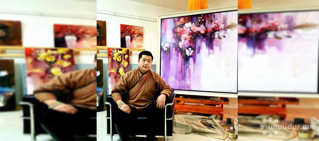 -Аавын ч, ээжийн ч талд гарын уртай хүн олон бий. Аав минь ч сайхан зурдаг. Би багаа саа зурах дуртай ч зураач болно гэж төсөөлж байгаагүй. Ахлах ангид багш “Хүүхдийн урлагийн их наадам болох гэж байна. Оролцоод үз” гэж ятгасан юм. Тэр уралдаанд оролцож, тэргүүн байрт шалгарсан. Тэргүүн байрын шагналын хамт “Од” дүрслэх урлаг, дизайн, технологийн дээд сургуульд суралцах урилга ирсэн юм. Тэгэхэд л би зураач болохоор шийдсэн дээ. Сурч байхдаа мэргэжлийнхээ амтанд улам дурлаж, сургууль дээрээ хонон өнжин л зурдаг байлаа. Олон хоног ядартлаа зурж суугаад гар татаж, сургуулийн захирал хүчээр гэрт минь хүргэж өгсөн хөгтэй түүх ч бий. Эл сургуульдаа суралцаж төгсөөд, 2010 онд “Их засаг” их сургуулийн харьяа Дүрслэх урлагийн сургууль болсноос нь хойш одоог хүртэл багшилж байна. Уран бүтээлч болох гэдэг амаргүй. Олон дунд хавчуулж, цавчуулахгүй, хүний доор орохгүй, зураач шиг зураач болох хэрэгтэй гэж бодож хичээсээр ирсэн. Үүнийгээ ч шавь нартаа захидаг юм.