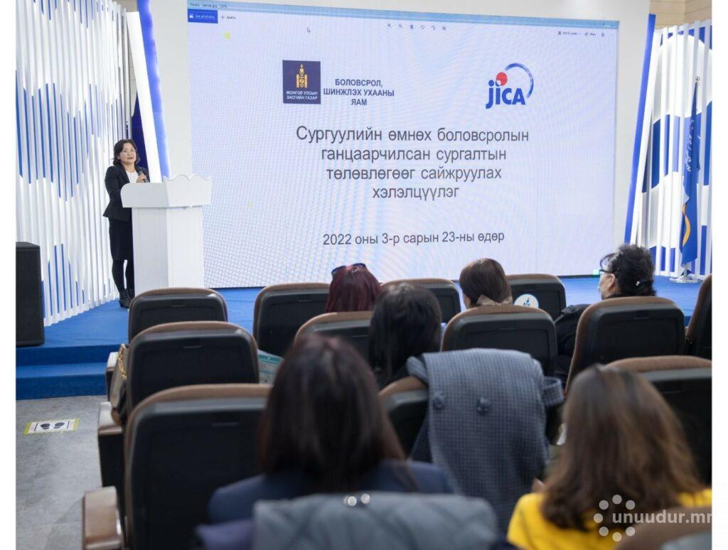 Сургуулийн өмнөх боловсролын “Ганцаарчилсан сургалтын төлөвлөгөө”-ний төслийн хэлэлцүүлгийг мэргэжлийн байгууллагуудын оролцоотой зохион байгууллаа. Сургуулийн өмнөх насны боловсролын тусгай хэрэгцээтэй хүүхдийг цэцэрлэгт хамруулахад энэхүү ганцаарчилсан сургалтын төлөвлөгөөг цэцэрлэгийн багш боловсруулж, эцэг эх, асран хамгаалагчидтай хамтран хүүхдийн хөгжлийн онцлог, хэрэгцээнд нийцсэн дэмжлэгийг үзүүлнэ. Хэлэлцүүлэгт ХНХЯ, Хөгжлийн бэрхшээлтэй хүний хөгжлийн ерөнхий газар, МУБИС-ийн СӨБ-ын сургууль, Сэргээн засах төв, Аутизмын холбоо, Сонсголгүйн боловсролын холбоо, Эрт оролцоо цогц хөгжил төв зэрэг ТББ, төрийн болон төрийн бус өмчийн тусгай цэцэрлэгийн эрхлэгч, арга зүйч, БШУЯ-ны харьяа газрын мэргэжилтэн, эрдэм шинжилгээний ажилтнууд оролцжээ.