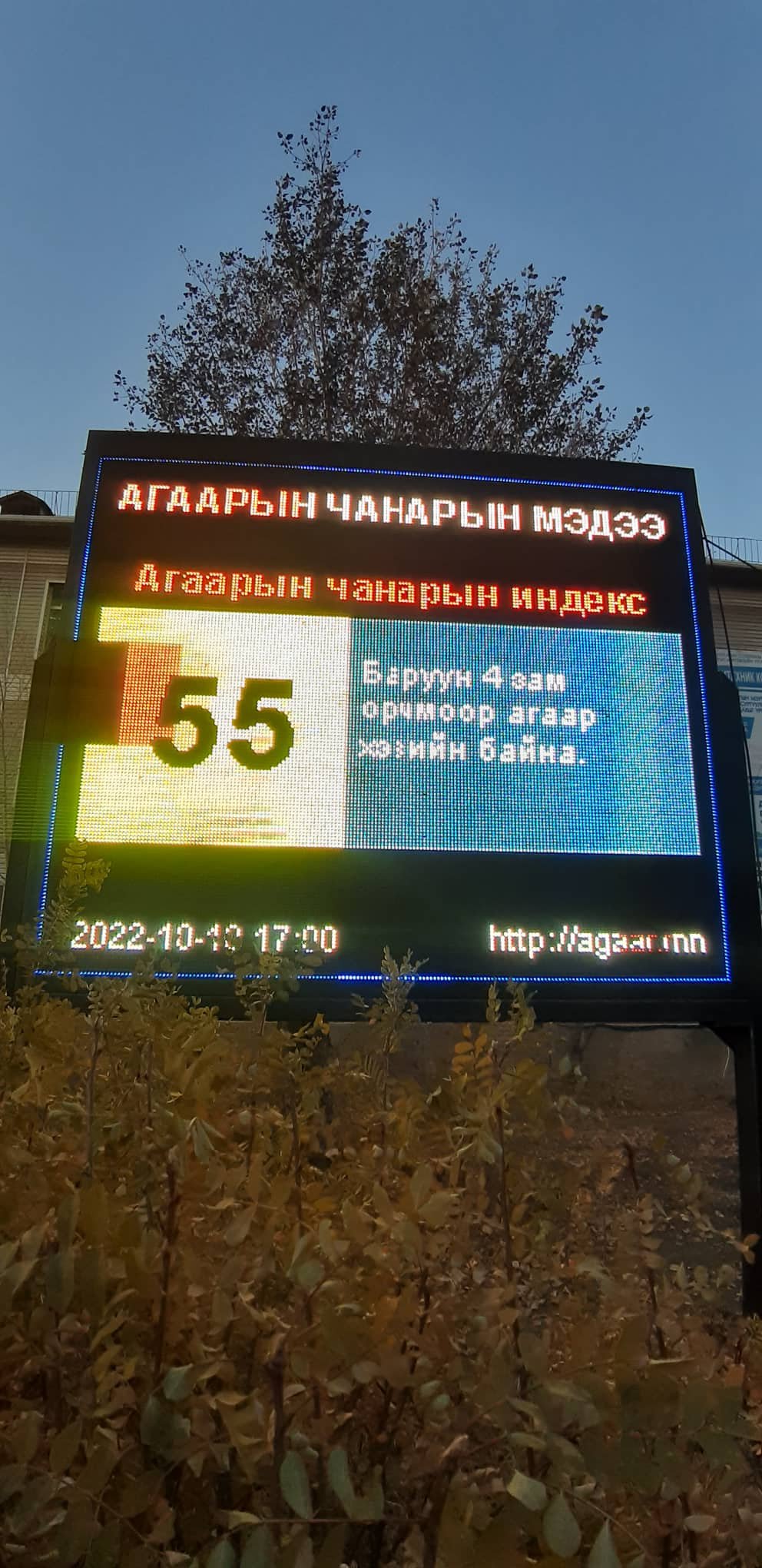 Галлагааны улирал эхэлсэнтэй холбоотойгоор нийслэлд агаарын чанар муудаж, утаа ихсэх болов. Агаарын чанарын харуулуудын мэдээлэл ч утааны улирал эхэлснийг “сануулж” байна. Тухайлбал, Цаг уур, орчны шинжилгээний газраас өнгөрсөн долоо хоногийн хугацаанд буюу энэ сарын 3-9-ний агаарын чанарын үзүүлэлтдийг хянаж, шинжлэв. Уг дүнгээр Зурагт, Шархад, Налайх, Зайсан, “Мишээл экспо” төв, “Ургах наран” хороолол орчимд агаарын чанарын үзүүлэлт сайн гарчээ. Харин I хороолол, Зуун айл, Толгойт, Нисэх, Хайлааст, Баруун дөрвөн зам, Амгалан орчимд зарим өдөр агаарын бохирдол стандартад зааснаас өндөр байв. Тухайлбал, агаар бохирдуулагчдын нэг нарийн ширхэгт тоосон цор I хороолол орчимд стандартаас 1.4 дахин их байсан аж. Мөн бүдүүн ширхэгт тоосонцор ДЦС-уудын ойр орчимд хүлцэх хэмжээнээс 1.6 дахин их байжээ. Түүнчлэн Баруун дөрвөн зам орчимд азотын давхар исэл стандартад заасан хэмжээнээс 1.3 дахин их байгааг тогтоосон гэнэ.