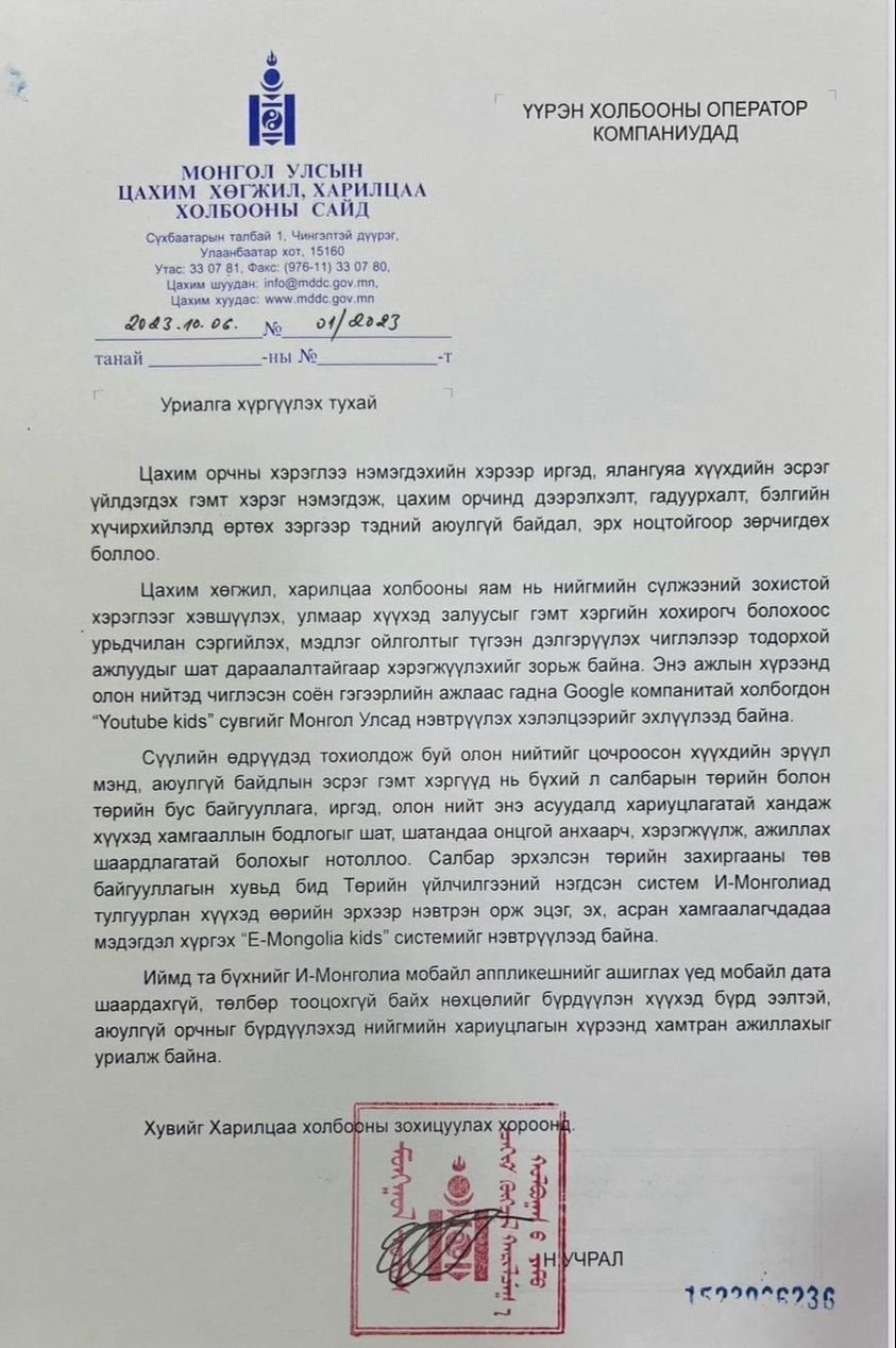 Цахим хөгжил, харилцаа холбооны сайд Н.Учралын уриалгыг үүрэн холбооны компаниуд хүлээн авч, E-Mongolia, шинээр яаралтай бүтээж буй e-kids-д нэвтрэхэд дата огт хэрэггүй боллоо. Мобиком, Юнител, Скайтел, Жи-Мобайл, Ондо компанийн удирдлагатай ЦХХХ-ны сайд өнөөдөр \2023.10.09\ уулзаж, E-Mongolia болон e-kids системийг үнэ төлбөргүй ашиглах уриалгыг бүрэн дүүрэн дэмжиж эвлэлдэн нэгдлээ.