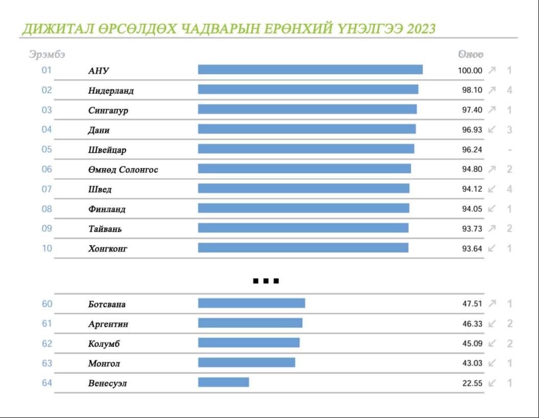 Олон Улсын менежментийн хөгжлийн хүрээлэнгийн дэргэдэх Дэлхийн өрсөлдөх чадварын төвөөс “Дэлхийн дижитал өрсөлдөх чадварын тайлан 2023”-ыг танилцууллаа. Тус тайлан нь Засгийн газар, бизнес, нийгмийн орчинд дэлхийн улсууд хэрхэн дижитал технологийн нээлт хийж технологид дасан зохицож байгааг харуулдаг.