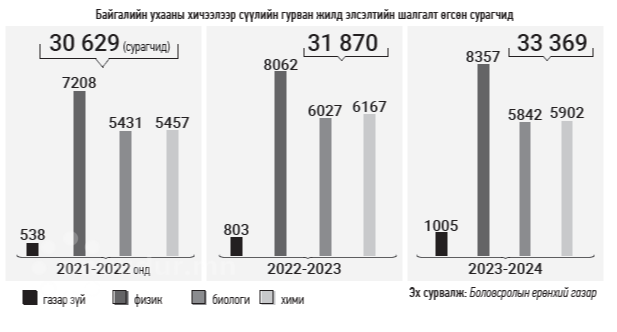Сүүлийн гурван жилийн статистик мэдээллээс харвал 2021-2022 онд нийт 31 908 сурагч арванхоёрдугааранги төгсөж, бүрэн дунд боловсрол эзэмшсэнээс 30 629 нь элсэлтийн шалгалт өгчээ. Тэднээс давхардсан тоогоор 538 нь газар зүйн хичээлээр шалгалт өгсөн бол физикээр 7208, биологиор 5431, химиэр 5457, нийгмийн ухаанаар 16 499, англи хэлний хичээлээр 17 696 сурагч шалгуулсан байна. Харин 2022-2023 онд 33 135 сурагч ерөнхий боловсролын сургууль төгссөнөөс 31 870 нь элсэлтийн шалгалт өгсөн аж. Тэдний 6027 нь биологи, 803 нь газар зүйн хичээлээр шалгалт өгсөн гэнэ. Харин физикээр 8062, химиэр 6167, нийгмийн ухаанаар 18 742, англи хэлний хичээлээр 19 822 сурагч шалгуулжээ. Тэгвэл 2023-2024 оны хичээлийн жилд нийт 33 369 сурагч эл шалгалтыг өгснөөс 1005 нь газарзүйн хичээлээр шалгуулсан байна. Харин физикээр 8357, биологиор 5842, химиэр 5902, нийгмийн ухаанаар 18 742, англи хэлний хичээлээр 19 822 сурагч шалгуулжээ. Үүнээс харвал төгсөх ангийн сурагчдын олонх нь нийгмийн ухаан болон англи хэлний хичээлээр элсэлтийн шалгалт өгдөг аж. Харин 20 хүрэхгүй хувь нь л физик, хими, биологи зэрэг байгалийн ухааны хичээлийг сонгодог юм байна. Үүний гол шалтгаан нь ерөнхий боловсролын сургуулийн сурагчдын олонх нь нийгмийн ухаан, англи хэлний хичээлээр элсэлтийн шалгалт өгдөгтэй холбоотой гэнэ. Өөрөөр хэлбэл, дээрх хичээлүүдээр олон суралцагч шалгуулдаг, өрсөлдөөн ихтэй учраас яаж ч хичээсэн хэмжээст оноо бага байдаг. Харин биологи, хими, физикээр элсэлтийн шалгалт өгөх хүн харьцангуй цөөн. Тиймээс хангалтгүй хийсэн ч хэмжээст оноо нь нэлээд өндөр гардаг юм байна. Тэгээд л их сургуульд хүссэн мэргэжлээрээ элсэхэд хэмжээст оноо нь хүрэхгүй бол “Одоохондоо байгалийн ухааны салбарт орчхоод, шалгалт өгөөд л хүссэннийгэм, эдийн засаг руугаа шилжье” хэмээн аргацааж, байгалийн ухааны салбарыг сонгодог хүн ч цөөнгүй аж.