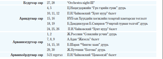 Энэ удаагийн улирлын тоглолтыг сонгодог урлагийн үндэс суурь болсон “Orchestra night III”-аар эхлүүлэх нь. Тус тоглолтын эхний өдөр уран бүтээлчид Францын хөгжмийн бүтээлүүдийг эгшиглүүлэх бол дараагийн өдөр нь Италиас уригдан ирэх уран бүтээлчидтэй хамтрах зэргээр тоглолт бүр сонирхолтой, гэнэтийн бэлгээр дүүрэн байх аж.