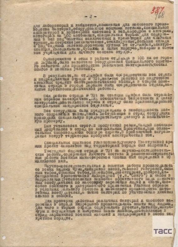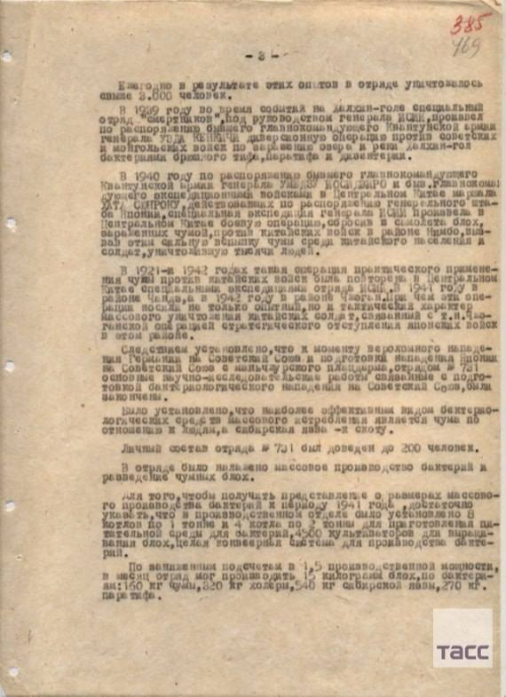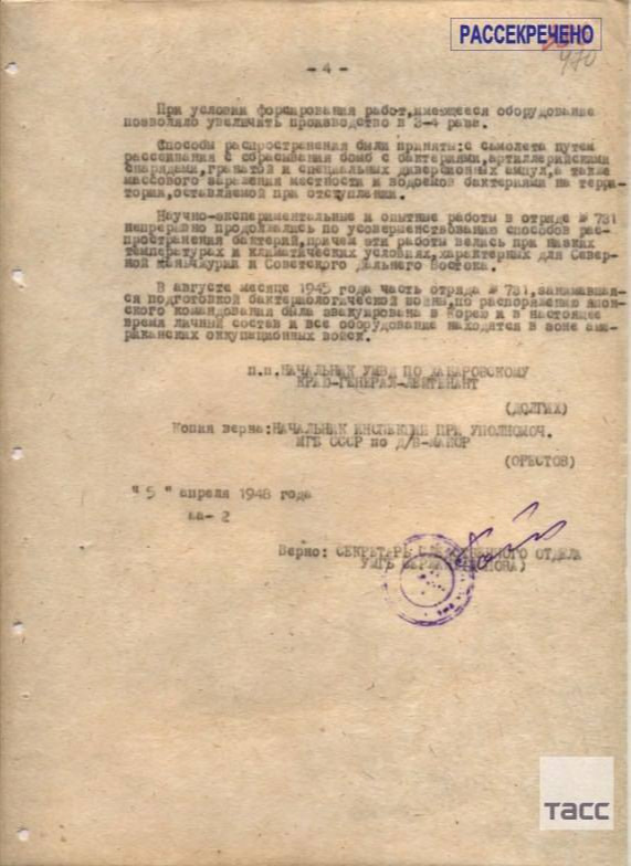 ОХУ-ын Холбооны аюулгүй байдлын албанаас Япон ЗХУ-ын эсрэг биологийн зэвсэг хэрэглэхээр бэлтгэж байсан талаарх баримтуудыг дэлгэжээ. Японы арми ухарсан тохиолдолд дайсны цэргүүд болон энгийн иргэдийн дунд өргөн олныг хамарсан тахал дэгдээж, тухайн газар нутагт зориуд халдвар тараахаар төлөвлөсөн байна. Япон улсаас Зөвлөлт, Хятад болон Америкийн цэргүүдийн эсрэг бактериологийн зэвсэг хэрэглэхээр төлөвлөж байсан тухай нууцаас гаргасан баримтын цахим хуулбарыг ОХУ-ын Холбооны аюулгүй байдлын алба (ФСБ) Улаан армийн анги нэгтгэлүүд Японы Квантуны армийг бут цохисны 80 жилийн ойг тохиолдуулан нийтэлжээ.