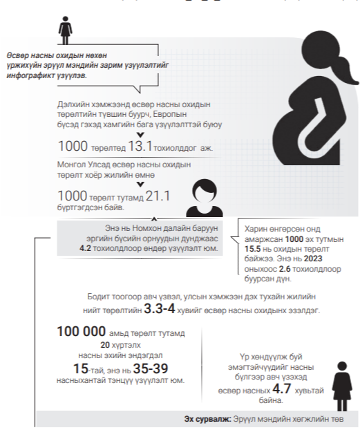 Эхийн эндэгдлийн нэг шалтгаан охидын жирэмслэлт, үр хөндөлт аж. Өнгөрсөн онд 100 000 амьд төрөлтөд өсвөр насны эхийн эндэгдэл 15-тай гарч. Тэрчлэн үр хөндөлтийн 12 676 тохиолдол бүртгэгдсэн байв. Насны бүлгээр авч үзэхэд 20-иос доош насныхан 4.7 хувийг эзэлжээ. Үүнийг өмнөх оныхтой нь харьцуулахад 0.3 хувиар буурсан дүн юм.