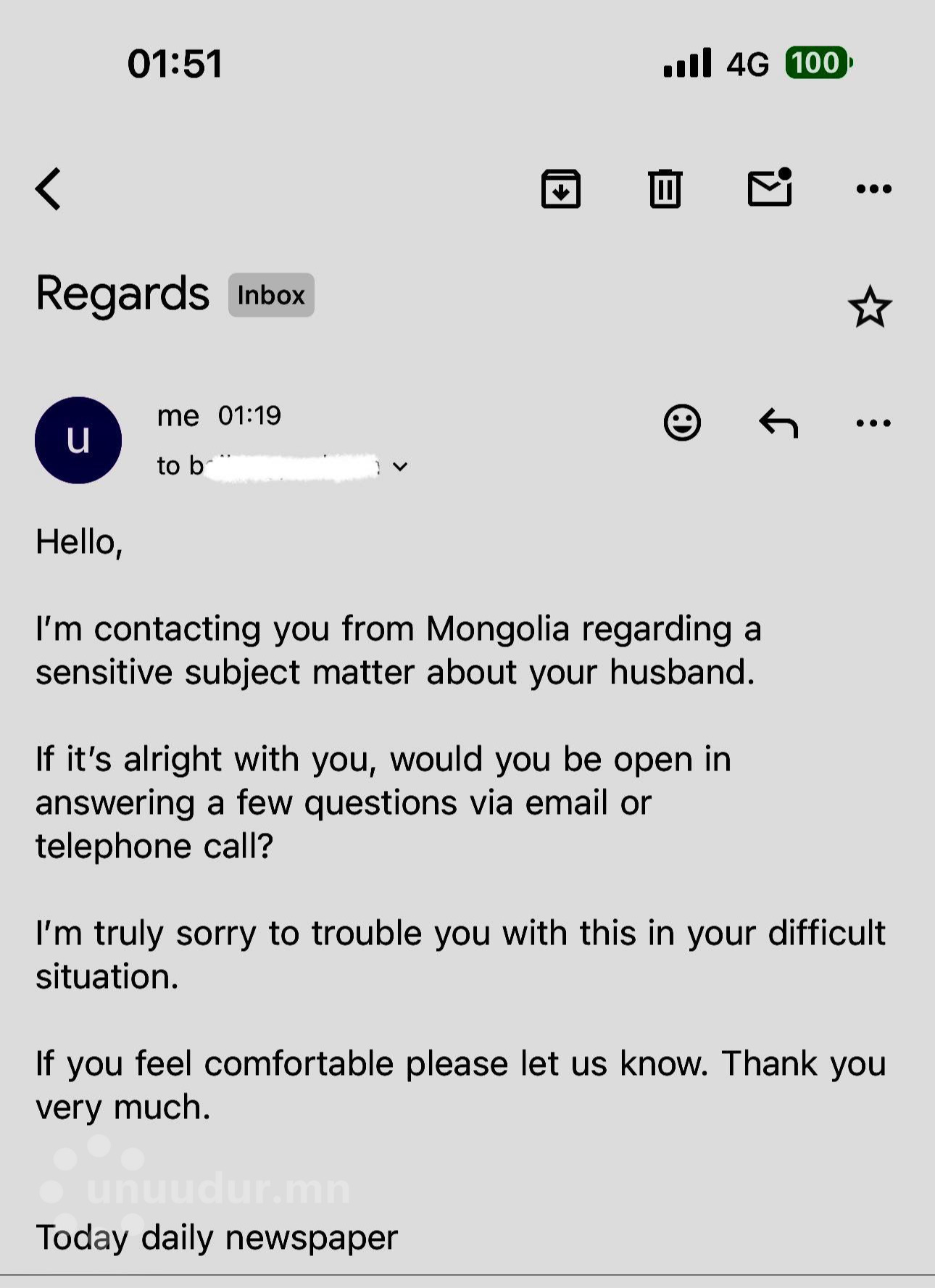 Сайн байна уу. Танай захидлыг хүлээн авлаа. Таныг захидал бичсэнд талархаж байна. Хэдийгээр би охины хамт ХБНГУ-д амьдарч байгаа боловч нас барсан нөхрийн маань талаар Монгол Улсад ямар мэдээлэл цацагдаад байгаа талаар мэдээлэл авсан байгаа.