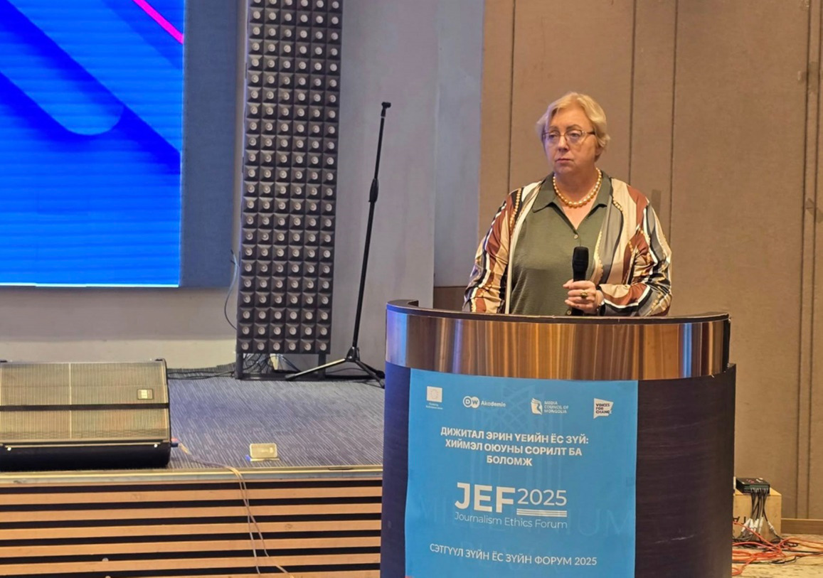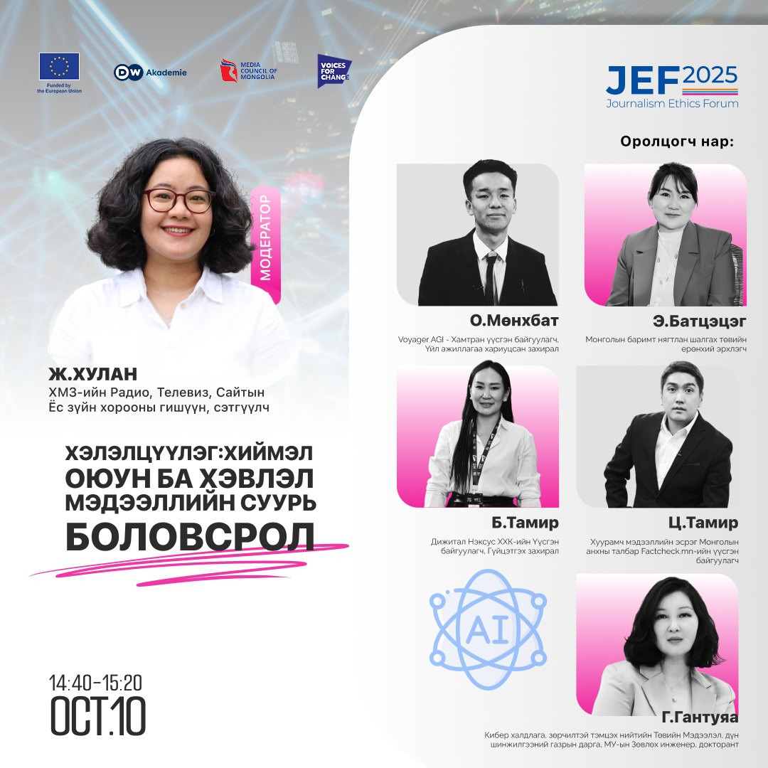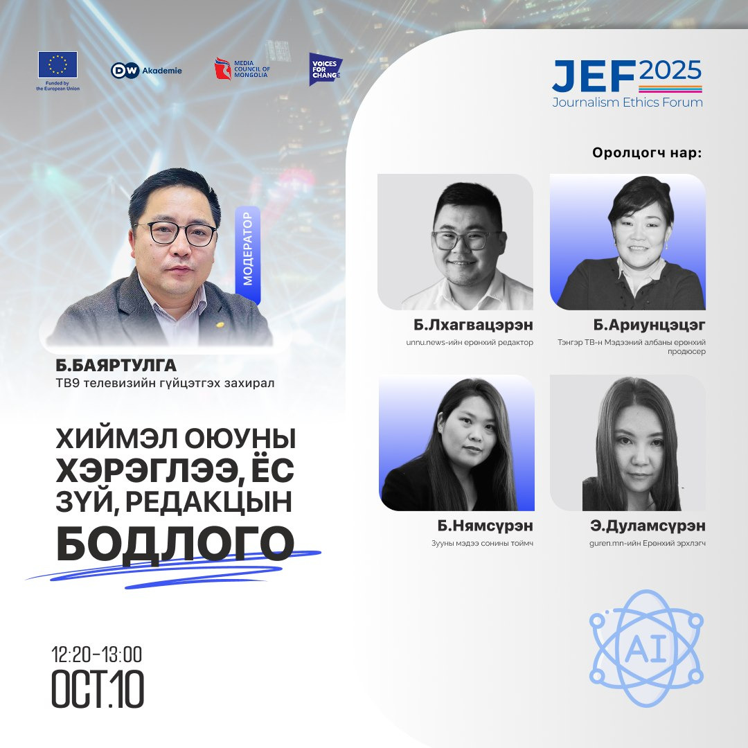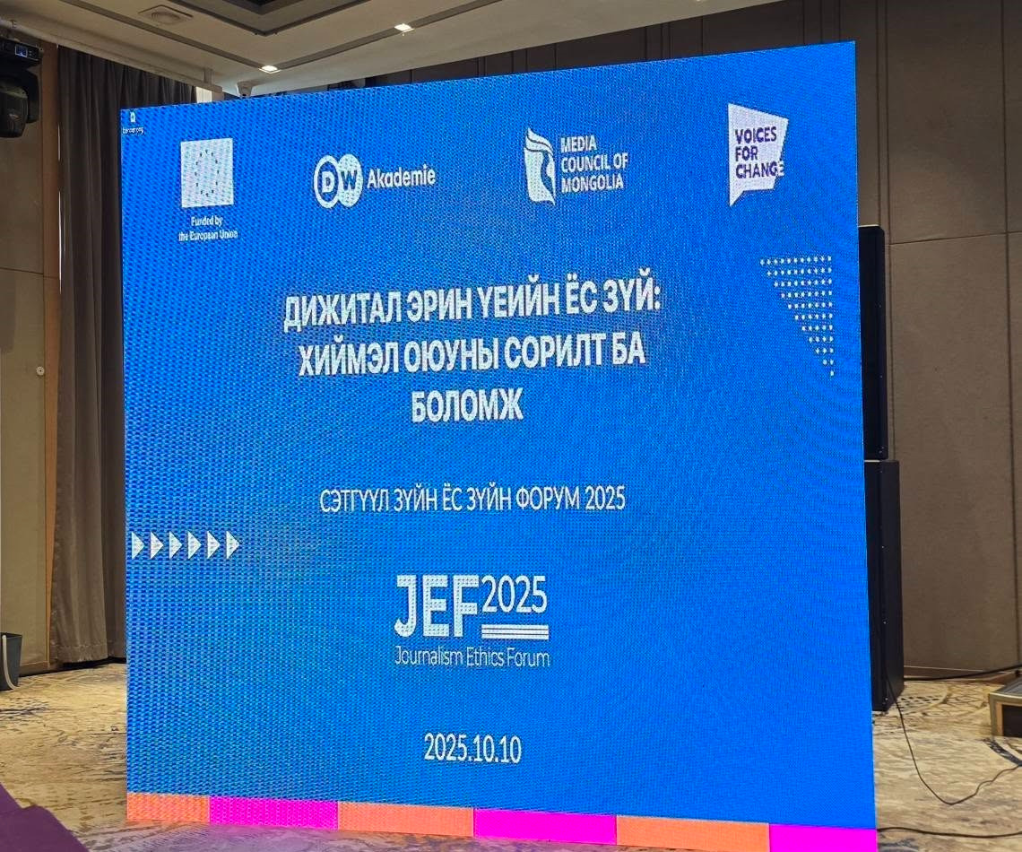 Өнөө жилийн Сэтгүүл зүйн ёс зүйн буюу JEF-2025 форум "Дижитал эрин үеийн ёс зүй: Хиймэл оюуны сорилт ба боломж" сэдвийн хүрээнд амжилттай болж өндөрлөлөө. Тодорхой хэлбэл, Хэвлэл мэдээллийн зөвлөлөөс зургаа дахь удаагаа зохион байгуулж буй эл форумаар дэвшилтэт технологи буюу AI эрчээ авч буй өнөө цагт хэвлэл мэдээллийн салбарынхан хэрхэн илүү хариуцлагатай бөгөөд ёс зүйтэй ажиллах боломжтой талаар голлон хэлэлцсэн юм.