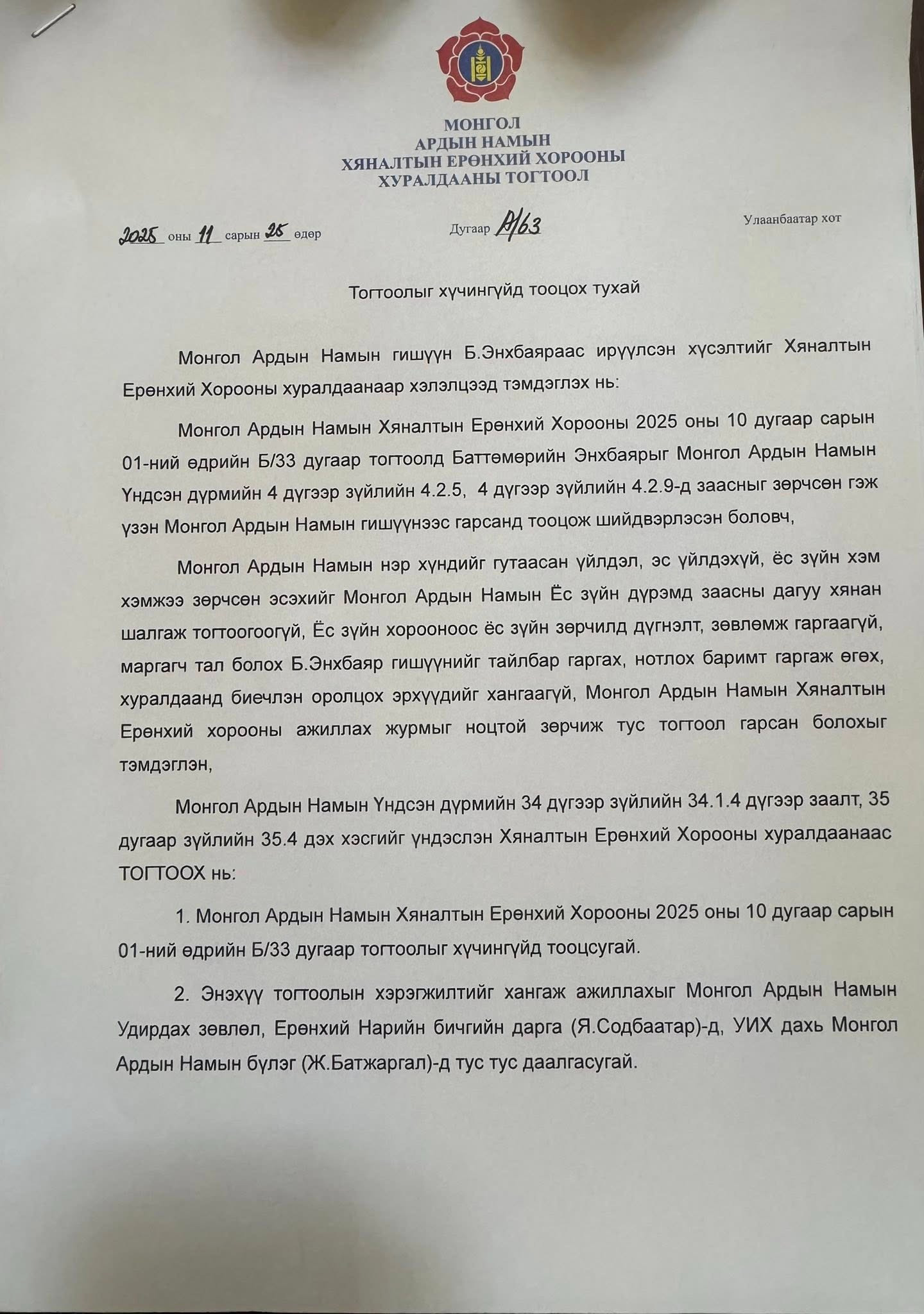 Эргэн сануулахад, МАН-ын Хяналтын ерөнхий хороо өнгөрсөн аравдугаар сард хуралдаж, УИХ-ын гишүүн Б.Энхбаярыг намаас хөөх эсэх асуудлыг хэлэлцсэн байдаг. Улмаар тус хорооны гишүүдийн олонх Б.Энхбаярыг МАН-аас хөөхийг дэмжсэн тул хөөсөн гэх мэдээллийг өгсөн байдаг.
