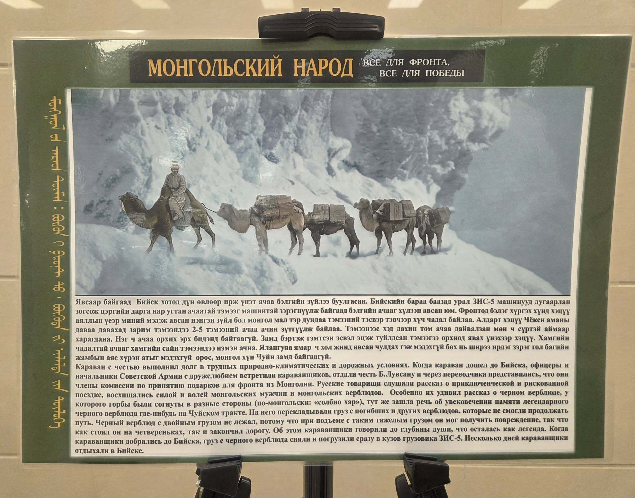 "Бүхнийг фронтод тэмээн жингийн цуваа" төслийн нээлт өнөөдөр Русский дом-д боллоо. Эх орны дайны хүнд жилүүдэд Монгол Улсын Ховд аймгийн Манхан сумаас Оросын Бийск Алтайн хязгаарт 1200 тэмээн цуваагаар фронтод хүмүүнлэгийн тусламж хүргэж байсан. Төслийн хүрээнд Монголын ард түмний дээрх сайн үйлсийг нэхэн санаж, эр зоригийг сурталчлан таниулах, элэг нэгт улсуудын харилцан туслалцаж ирсэн түүхэн дурсгалыг мөнхжүүлэх зорилготой юм.
