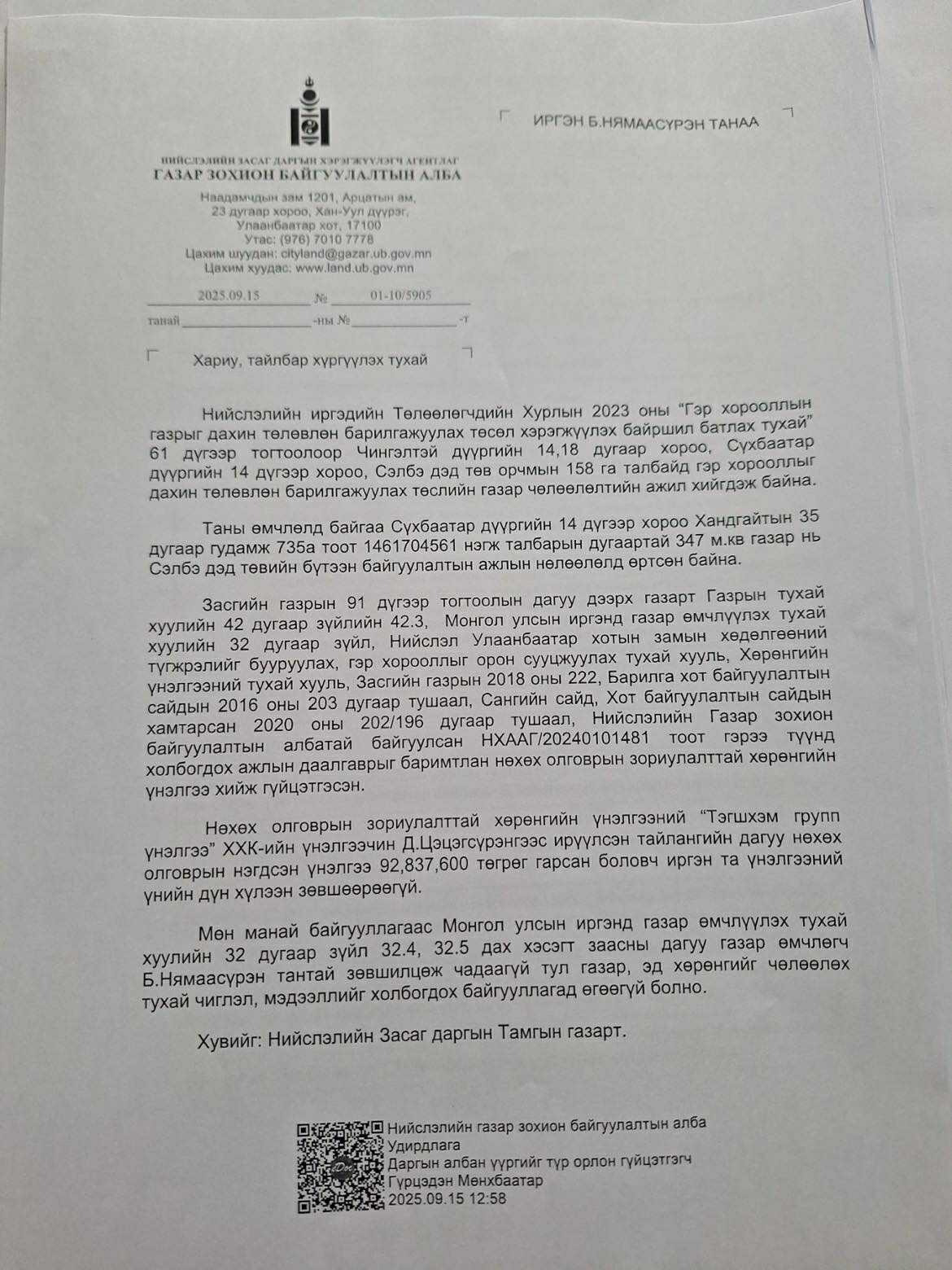 Газар зохион байгуулалтын албанаас иргэн Б.Нямаасүрэнд хариу өгсөн албан бичигтээ “Иргэн Б.Нямаасүрэн та “Тэгшхэм групп үнэлгээ” компанийн гаргасан газрын үнэлгээ болох 92 837 600 төгрөгийг хүлээн зөвшөөрөөгүй.