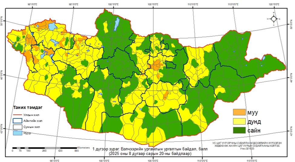 Засгийн газрын 286 дугаар тогтоолын дагуу бэлчээрийн талбай, ашиглалт, ургамлын гарц, малын тоо толгойд үндэслэн 2025-2026 оны өвөл, хаврын бэлчээрийн даацын төлөвийг урьдчилан тодорхойлсноо ЦУОШГ-аас танилцууллаа.