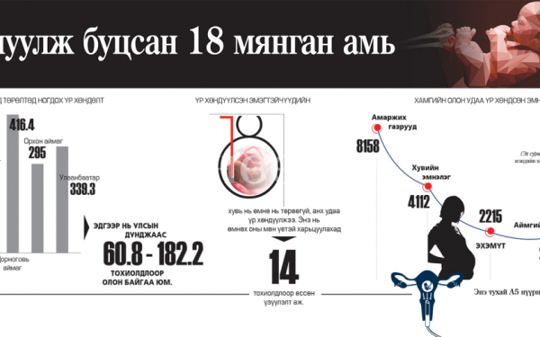 Өнгөрсөн онд Монгол Улс 18316 “иргэн”-ээ ирэх замаас нь буцаасан байх юм. Энэ нь зөвхөн эмнэлгийн байгууллагад бүртгэгдсэн тоо. Хууль бусаар, ямар ч хяналтгүйгээр үр хөнддөг газар манайд цөөнгүй. Тэнд хэчнээн эмэгтэй үр хөндүүлж буйг хэлэхэд бэрх. Улсын хэмжээнд 1000 амьд төрөлтийн 234.2, нөхөн үржихүйн насны 1000 эмэгтэйн 2.1 нь үр хөндүүлж буй гэх. Хувийн эмнэлэгт үр хөндүүлэх эмэгтэйчүүдийн тоо 28 хувиар өсчээ.