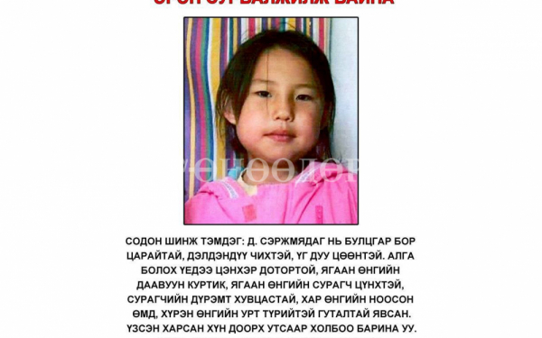 Охины талаарх мэдээллийг 96660300, 70527102 дугаарын утсаар авахаа зарлаад байна. Тус сум дахь Цагдаагийн хэлтсийн эх сурвалж “Эцэг эх нь тухайн үед гэртээ байгаагүй, сургууль руугаа охин ганцаараа явж буйг нь харсан гэрч бий. Хичээлд нь оруулаагүй гэх мэдээлэл цацагдсан нь ташаа. Бид бүх газрыг самнан хайж байгаа. Одоогоор ямар ч ул мөр алга. Хилээр гарсан тухай мэдээлэл байхгүй” гэсэн юм.