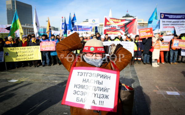 Тэтгэвэрт гарах насыг 65 хүртэл үе шаттайгаар нэмэх, 1.5 сая болон түүнээс дээш цалинтай иргэдийн Хувь хүний орлогын албан татвар (ХХОАТ)-ыг 15-25 хувь болгохыг эсэрцгүүцэж МҮЭХ-ноос Сүхбаатарын талбайд 12.00-14.00 цагт эсэргүүцлийн жагсаал зохион байгуулав.