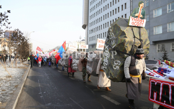 Ийнхүү цуглаан зохион байгуулагчид үг хэлсний дараа намын гишүүд, дэмжигчид Сүхбаатарын талбайг нар зөв тойрч, Төрийн ордонд суугаа эрх баригчдаас ажлаа хийж, амлалтаа биелүүлэхийг шаардсан юм.