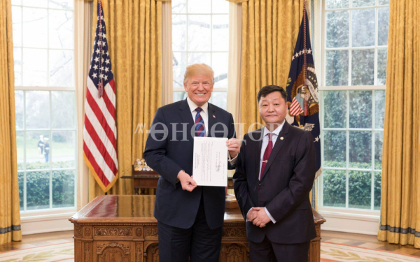 Монгол Улсаас Америкийн Нэгдсэн Улсад суух Онц бөгөөд Бүрэн эрхт Элчин сайд Ё.Отгонбаяр АНУ-ын Ерөнхийлөгч Доналд Трампд 2018 оны 3 дугаар сарын 28-ны өдөр итгэмжлэх жуух бичгээ өргөн барив.
