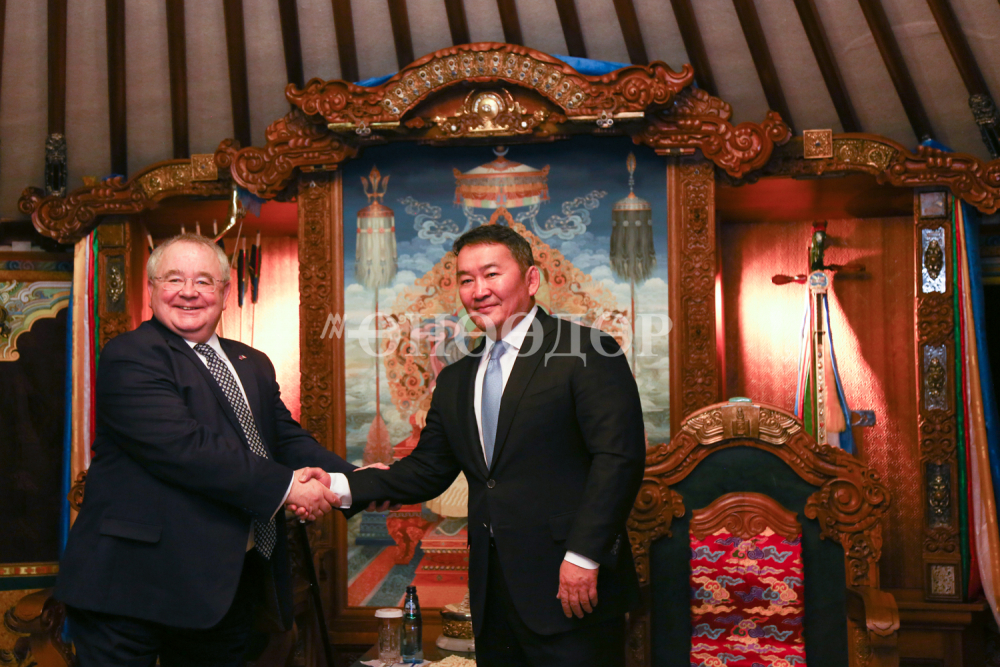 Харин өнөөдөр УИХ-ын дарга М.Энхболд Монгол Улсад албан ёсны айлчлал хийж буй Ирланд Улсын Парламентын Доод танхимын дарга Шон О’Фарелыг их жанжин Д.Сүхбаатарын талбайд угтан авч, мэндчиллээ. УИХ-ын дарга М.Энхболд эрхэм зочны хамт их эзэн Чингис хааны хөшөөнд хүндэтгэл үзүүлсний дараа Төрийн ордны Ёслол хүндэтгэлийн өргөөний Баганат танхимд саатан Ирланд Улсын Парламентын Доод танхимын дарга Шон О’Фарел хүндэт зочны дэвтэрт сэтгэгдлээ үлдээн, гарын үсэг зурав. Дараа нь Ирланд Улсын Парламентын Доод танхимын дарга Шон О’Фарел, Монгол Улсын Их Хурлын дарга М.Энхболд нарын уулзалт эхлээд байна.