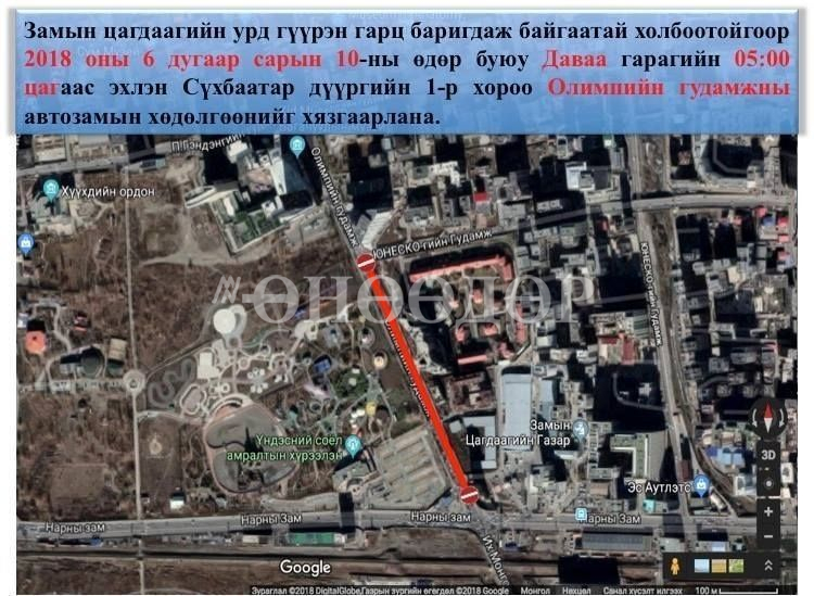 Замын цагдаагийн урд гүүрэн гарц баригдаж байгаатай холбоотойгоор 2018 оны 6 дугаар сарын 11-ний өдөр буюу Даваа гарагийн 05:00 цагаас эхлэн Сүхбаатар дүүргийн 1-р хороо Олимпын гудамжны авто замын хөдөлгөөнийг хязгаарлалаа.