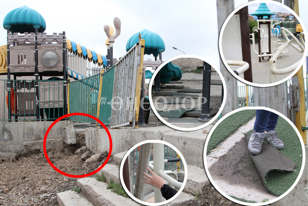 Мөн ойр орчимд нь дугуйтай хүүхдүүд шаагилдаж, дунд ангийн сурагч бололтой хоёр хүүхэд сагс тоглож байлаа. Гэвч очиход өөр орчин угтах нь тэр. Сагсны талбай нь бороо орохоор усанд автчихдаг юм байна. Сүүдрэвчнийх нь сандал эвдэрчээ. Нураагаад түлэхээс өөрөөр ашиглахаас өнгөрч. Савлуур нь ч хэд хэдэн удаа эвдэрсэн бололтой, энд тэнд нь төмөр утсаар ярзайтал нь бэхэлчихэж. Балчир хүүхдүүд энд тогловол хөл, гараа хүүлж мэдэхээр юм. Тэнд тоглож байсан хүүхдүүд гол дотор машин хаа сайгүй холхидог, тиймээс анхааралтай байхгүй бол осолд орох эрсдэлтэйг хэлэв.