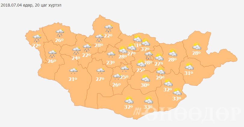 Баруун аймгуудын нутгаар үүлэрхэг. Бусад нутгаар үүлшинэ. Баруун болон төвийн аймгуудын нутгийн зарим газраар бороо орно. Дуу цахилгаантай. Борооны өмнө салхи түр зуур ширүүснэ. Бусад нутгаар бороо орохгүй. Дархадын хотгор, Алтай, Хангай, Хөвсгөл, Хэнтийн уулархаг нутаг, Тэрэлж голын хөндийгөөр 18-23 хэм, Орхон-Сэлэнгийн сав газар, Алтайн өвөр говь болон говийн бүс нутаг, Дарьгангын тал нутгаар 30-35 хэм, бусад нутгаар 24-29 хэм дулаан байна.