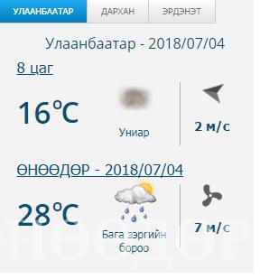 Улаанбаатар хотод бага зэргийн бороо орно. Салхи баруун өмнөөс секундэд 5-10 метр. 28 хэм дулаан байна. Малчид, иргэдэд зориулсан мэдээ: Өнөөдөр баруун болон төвийн аймгуудын нутгийн зарим газраар бороо орж, бусад нутгаар халуун байна.
