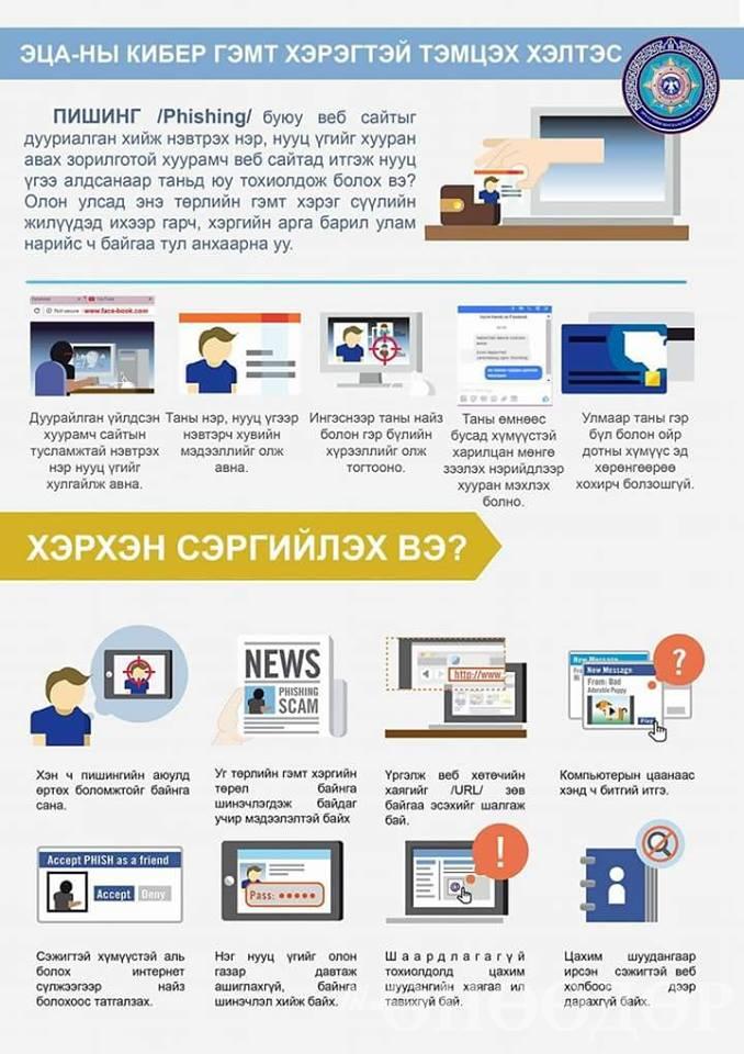 ЦЕГ-ын Кибер гэмт хэрэгтэй тэмцэх хэлтсээс "Зээл гаргаж өгнө, виз гаргаж өгнө, мөнгө шилжүүлнэ" гэх заруудыг хуурамч фэйсбүүк хаягнаас зарын группуудээр тарааж байгаа талаар сэрэмжлүүллээ. Тухайлбал, гадаад улсын гэмт бүлэглэлүүд бусдын фэйсбүүк хаягт хууль бусаар нэвтэрч тухайн хаягийг ашиглан залилан мэхлэх гэмт хэрэг үйлдэж байгаа тул иргэдийг дээрх утга бүхий заруудаар дамжуулж ямар нэг байдлаар мөнгө шилжүүлж хохирохгүй байхыг анхааруулж байна.