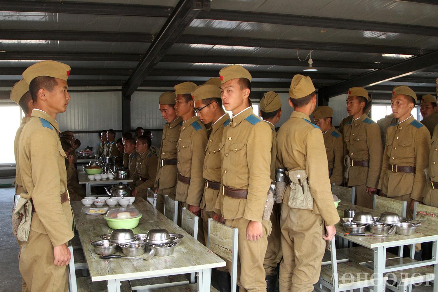 13.40 цаг. Дахиад л бүрээн дуу. Энэ бол өдрийн хоолны дохио. Байлдагч нар журам ёсоор жагсаалын талбайд нэгдэж, буугаа орхицгооно. Сайтар ажвал тэдний нэг нь туг барьж, нэлээд хэд нь бууныхаа үзүүрт улаан даавуу зангидсан харагдлаа. Учрыг асуухад, Тэргүүний салаагаа долоо хоногоор ээлжлэн шалгаруулж, шилжин явах туг гардуулдаг аж.