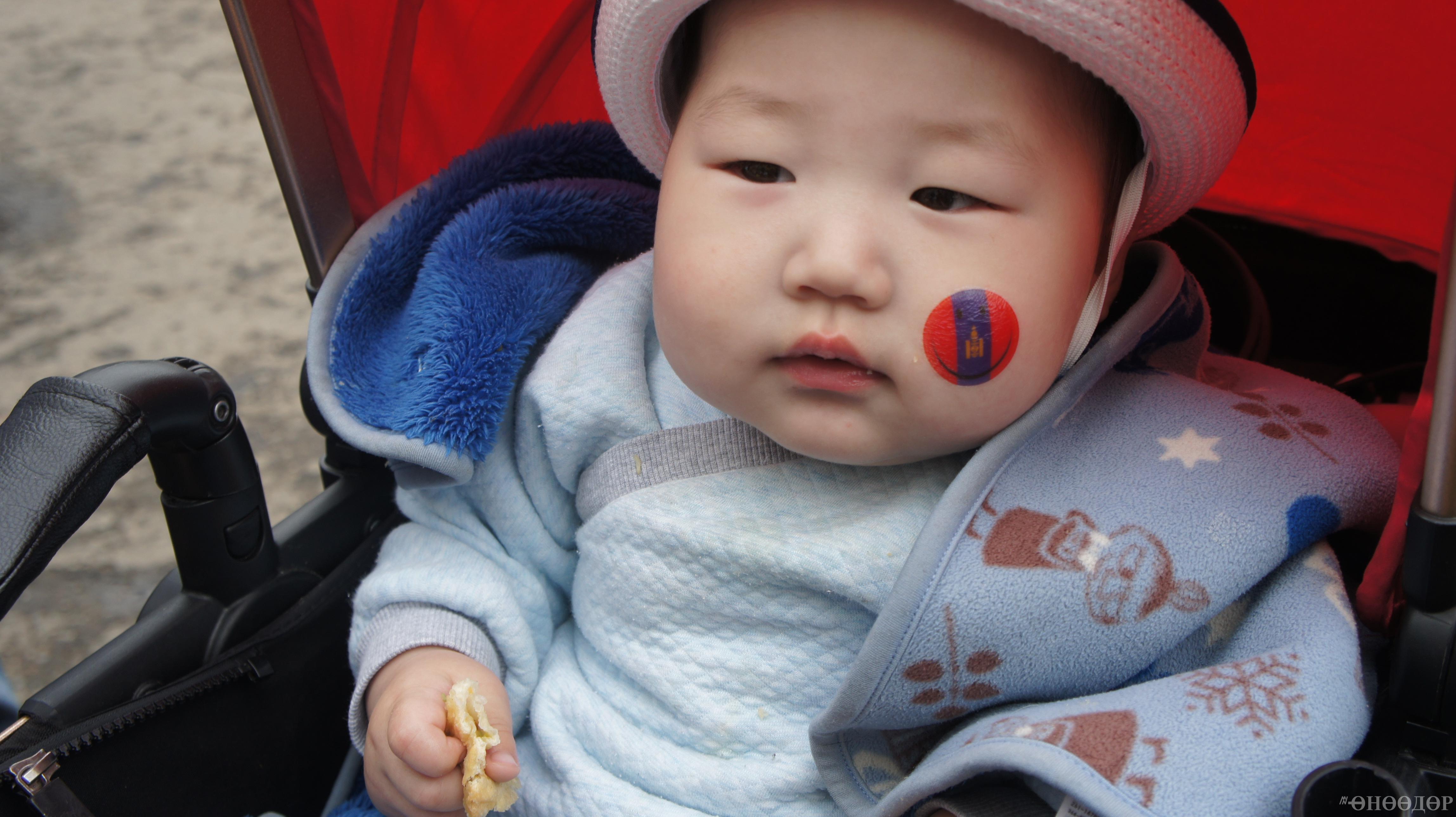 Наадмын хуушуураа зооглож байгаа бяцхан жаал. Төв цэнгэлдэхэд очсон хүүхдүүдийн ихэнх нь ийм шивээс хийлгэсэн байлаа. Булцгар хацар дээр нь шивээс гоё зохих юм.