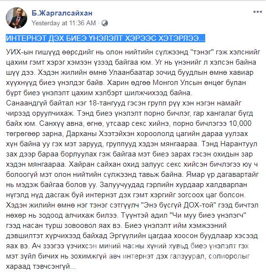 Санаандгүй байтал нэг 18-тангууд гэсэн групп рүү хэн нэгэн намайг чирээд оруулчихаж. Тэнд биеэ үнэлэлт порно бичлэг, гар хангалаг бүгд байх юм. Санхүү авна, өгнө, утсаар секс хийнэ, порно бичлэгээ 10,000 төгрөгөөр зарна, Дарханы Хээтэйхэн хороололд цагийн дараа уулзах хүн байна уу гэх мэт зарууд, группууд хэдэн мянгаараа. Тэнд Нарантуул зах дээр бараа борлуулах гэж байгаа мэт биеэ зарах гэсэн охидын зар хэдэн мянгаараа. Хайран сайхан охид залуус секс хийсэн бичлэгээ юу ч болоогүй мэт олон нийтийн сүлжээнд тавьж байна. Ямар үр дагавартайг нь мэдэж байгаа болов уу. Залуучуудад гэрлийн хурдаар халдварлан нүгэлд нүд дасгаж буй интернэт дэх гэмт хэргийг зогсоох цаг болсон. Хэдэн жилийн өмнө нэг тэнэг сэтгүүлч "Энэ бүсгүй ДОХ-той" гээд бичтэл нөхөр нь зодоод алчихаж билээ. Түүнтэй адил "Чи муу биеэ үнэлэгч" гээд насан турш зовоовол яах вэ. Биеэ үнэлэлт ийм хэмжээний дэвшилтэт хүрчихээд байхад Эргүүлийн цагдаа хоосон буудлаар хэсээд яах вэ. Ач зээгээ үзчихсэн миний насны хүний хувьд биеэ үнэлэлт гэх мэт зүйл бичих нь зохимжгүй авч интернэт дэх галзуурал, солиоролыг хараад тэвчсэнгүй..." гэсэн байна.