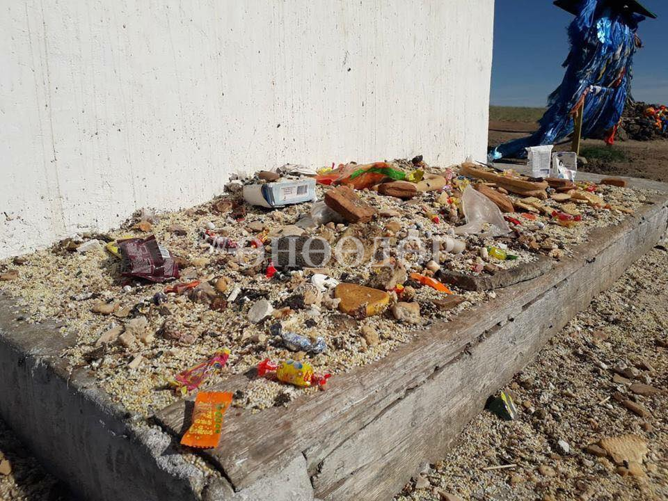 Гэвч зөвхөн төр, засгийн түшээд, орон нутгийн удирдлага, эсвэл лам хуврагууд л оройд нь гарна гээд байсан цог хийморийн овоон дээр архины шил, ундааны сав, ууттай чихрийн цаас, сүүний хайрцаг, ууцны сүүл, зассан тавгийн идээ хүртэл тэр чигтээ үлдэж хоцорсон байх юм. Энэ “хог”-ийг өнөөх эрх мэдэл бүхий мундаг хүмүүс нь үлдээсэн үү, эсвэл монгол хүний мухар сүсгээр тахилга дууссаны дараа ч хамаагүй овоо руу гарч, хувийн идээ ундаагаараа өргөл барих гэсэн энгийн ард тарьсан уу гэдгийг эндээс таашгүй.