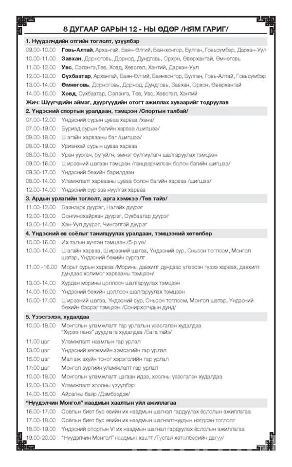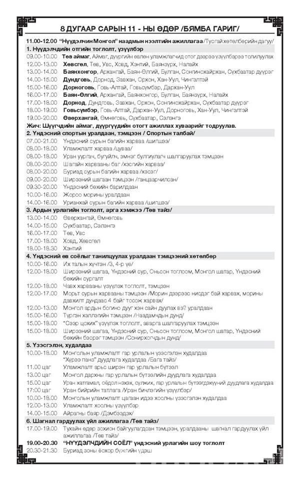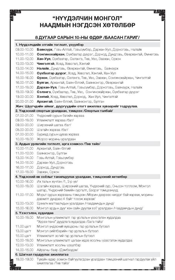 "Нүүдэлчин Монгол" наадамд 21 аймаг, нийслэлийн есөн дүүргийн 700 гаруй ардын авьяастнууд, гар урчууд болон үндэсний спортын 2000 гаруй тамирчид оролцох бөгөөд наймдугаар сарын 10-12-ны өдрүүдэд Хүй долоон худгийн “Монгол наадам” цогцолборт болох юм. Тус наадмын нэгдсэн хөтөлбөрийг танилцуулж байна.
