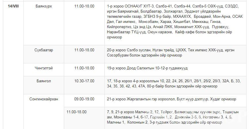 Цахилгааны хязгаарлалт хийгдэж буй газруудыг танилцуулж байна: