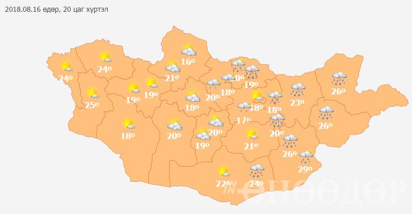 2018 оны 08 дугаар сарын 16-ны 08 цагаас 20 цаг хүртэл: Нутгийн зүүн хэсгээр үүлэрхэг. Бусад нутгаар солигдмол үүлтэй. Зүүн аймгуудын ихэнх нутаг, төв болон говийн аймгуудын нутгийн зүүн хэсгээр бороо орно. Дуу цахилгаантай. Салхи зүүн аймгуудын нутгаар баруун өмнөөс хойш эргэж, бусад нутгаар баруун хойноос секундэд 6-11 метр, говь, талын нутгаар секундэд 13-15 метр хүрч ширүүснэ. Дархадын хотгор, Алтай, Хангай, Хөвсгөл, Хэнтийн уулархаг нутгаар 15-20 хэм, Алтайн өвөр говь, Их нууруудын хотгор, говийн аймгуудын нутгийн зүүн хэсгээр 24-29 хэм, бусад нутгаар 18-23 хэм дулаан байна.