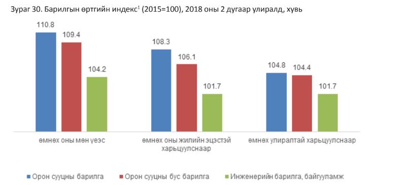 Орон сууцны барилгын өртөг туршилт тооцоогоор 2018 оны 2 дугаар улиралд өмнөх улирлаас 4,8 хувь, өмнөх оны мөн үеэс 10,8 хувь, өмнө жилийн эцсээс 8,3 хувиар өссөн байна. Харин орон сууцны бус барилгын өртөг өмнөх улирлаас 4,4 хувь, өмнөх оны мөн үеэс 9,4 хувь, өмнөх хилийн эцсээс 6,1 хувиар өслөө. Инженерийн барилга, байгууламжийн өртөг өмнөх улирал болон өмнөх жилийн эцсээс 1,7 хувь, өмнөх оны мөн үеэс 4,2 хувиар өсөхөд авто замын байгууламжийн өртөг 4,4 хувиар өссөн нь голлон нөлөөлсөн байна.