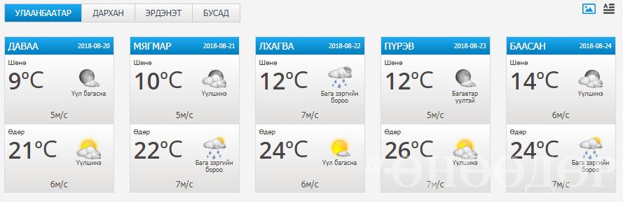 Улаанбаатар хотод багавтар үүлтэй. Бороо орохгүй. Салхи баруунаас секундэд 5-10 метр. 20-22 градус дулаан байна. Энэ сарын 21-нд нутгийн төв хэсгээр, 22-нд баруун болон зүүн аймгуудын нутгийн зарим газраар дуу цахилгаантай бороо орно. Ихэнх нутгаар солигдмол үүлтэй. Баруун аймгуудын нутгийн хойд, төвийн аймгуудын нутгийн баруун хойд, зүүн аймгуудын зарим газар, говийн аймгуудын нутгийн зүүн хэсгээр бороо орно. Дуу цахилгаантай. Бусад нутгаар бороо орохгүй. Салхи нутгийн баруун хэсгээр баруунаас, бусад нутгаар баруун хойноос секундэд 6-11 метр, говь болон зүүн аймгуудын нутгийн зарим газраар секундэд 12-14 метр хүрч ширүүснэ. Дархадын хотгор, Алтай, Хангай, Хөвсгөл, Хэнтийн уулархаг нутаг, Идэр, Тэс, Тэрэлж голын хөндий, Хүрэнбэлчир орчмоор 17-22 градус, Их нууруудын хотгор болон Алтайн өвөр говиор 29-34 градус, говийн бүс нутгаар 23-28 градус, бусад нутгаар 20-25 градус дулаан байна.