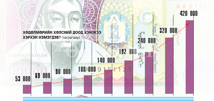 Хөдөлмөрийн хөлсний доод хэмжээг эрс нэмэгдүүлж, 2020 он гэхэд одоогийнхоос даруй 75 хувиар өсгөх шийдвэрийг бид хоёр ч удаа завсарлага авч байж гаргуулав” хэмээн МҮЭХ-ныхон хөөрцөглөж байна. Уг нь цалин нэмнэ гэдэг сайхан мэдээ баймаар. Гэвч энэ сүржин мэдэгдлийг сонсоод баярлаж хөөрөх сэтгэл надад лав төрөхгүй байна. Надтай адил цаг наргүй зүтгэж, цалингаараа мөчиг тачигхан амьдардаг дундчууд ч бүгд дарга нарын гэнэтийн ивээлээс жийрхэж суугаа нь ярианаас нь илт.