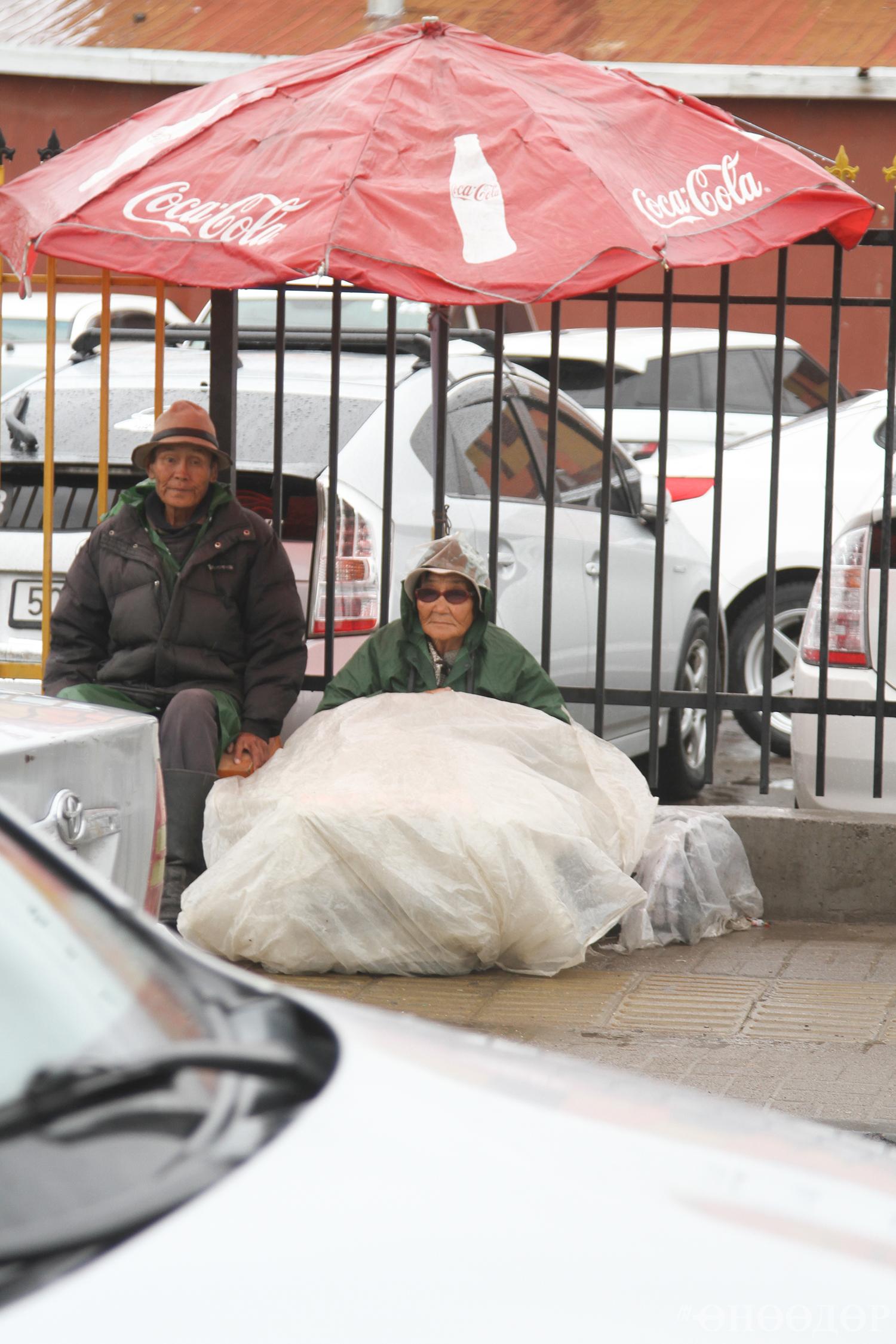 Өөр уулзаад ярилцчихаж болмоор хүмүүс хайж цааш хараачилбал тэндээс холгүйхэн төв зам дагуу хашаа налан сууж буй хүйтэн бороонд норж бээрсэн болжмор шиг хоёр хөгшин нүдэнд туслаа. Урдаа тавьсан зүйлээ бороонд норохоос хамгаалж гялгар цаасаар бүтээснийг бодоход үүргийн худалдаачин бололтой. Тэдэнтэй уулзахаар шийдэв.