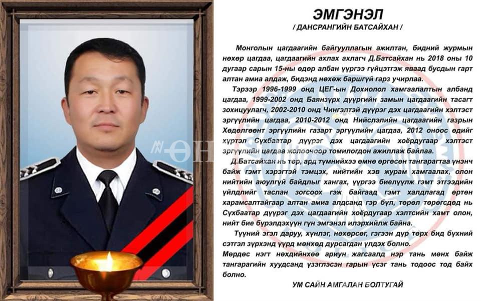 Албан үүргээ гүйцэтгэж яваад гэмт этгээдүүдийн халдлагад өртөн хүнд гэмтсэн цагдаагийн ахлах ахлагч П.Батсайхан өчигдөр 13.25 цагийн үед ГССҮТ-д таалал төгслөө. Тэрбээр энэ сарын 15-нд Япон цэргийн дурсгалын цогцолбор орчимд офицерийн хамт үүрэг гүйцэтгэж байхдаа улаан хүрэн өнгийн “Ланд круйзер Прадо” маркийн автомашины зогсоон шалгасан юм. Гэвч гэмт этгээдүүд цагдаагийнхнаас зугтаж, тэднийг зогсоох гэж машинаас зүүгдэн цонхыг нь хагалахаар оролдож байгаа бичлэг олон нийтийн сүлжээнд цацагдсан.